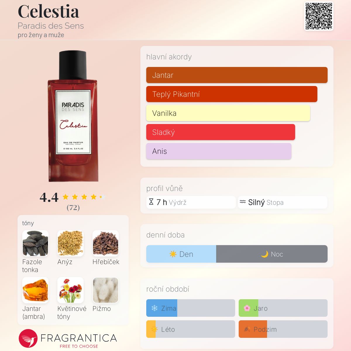 Celestia podle Paradis des Sens je Orientální Floral vůně pro ženy a muže. Celestia byl/a uveden/a v roce 2021. "Nosem" za touto vůní je Guillaume Cresp. Vrchní tóny jsou Anýz, Květinové tóny a Černý pepř; střední tóny jsouHřebíček a Konvalinka ; základní tóny jsou Fazole tonka, Jantar (ambra) a Pižmo.