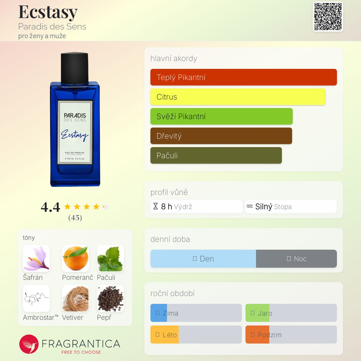 Ecstasy podle Paradis des Sens je Woody Spicy vůně pro ženy a muže. Toto je nová vůně. Ecstasy byl/a uveden/a v roce 2024. "Nosem" za touto vůní je Suzy Le Helley. Vrchní tóny jsou Pomeranč, Černý pepř a Bergamot; střední tóny jsouŠafrán, Konvalinka a Otočník ; základní tóny jsou Pačuli, Ambrostar™ a Vetiver.