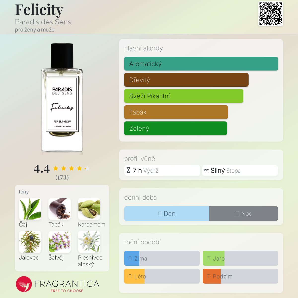 Felicity podle Paradis des Sens je Orientální Floral vůně pro ženy a muže. Felicity byl/a uveden/a v roce 2020. Vrchní tóny jsou Tabák, Kardamom, Jalovec a Bergamot; střední tóny jsouŠalvěj, Plesnivec alpský, Dřevité tóny a Pižmo ; základní tóny jsou Černý čaj, Dubový mech, Kůže a Santalové dřevo.