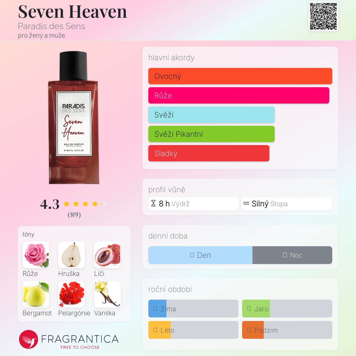 Seven Heaven podle Paradis des Sens je Floral Woody Musk vůně pro ženy a muže. Seven Heaven byl/a uveden/a v roce 2023. "Nosem" za touto vůní je Philippine Courtière. Vrchní tóny jsou Hruška, Liči a Bergamot; střední tóny jsouRůže, Pelargónie a Orris ; základní tóny jsou Vanilka, Pižmo a Jantar (ambra).