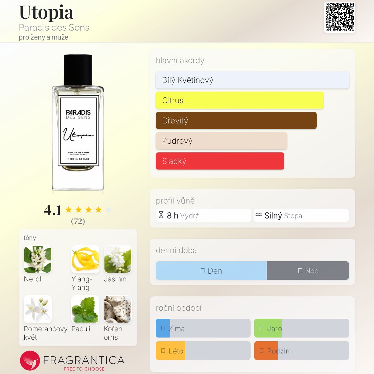 Utopia podle Paradis des Sens je Floral Woody Musk vůně pro ženy a muže. Utopia byl/a uveden/a v roce 2020. Vrchní tóny jsou Ylang-Ylang, Mandarinka a Bergamot; střední tóny jsouNeroli, Jasmín, Pomerančový květ a Růže ; základní tóny jsou Pačuli, Kořen orris, Santalové dřevo, Vanilka a Pižmo.
