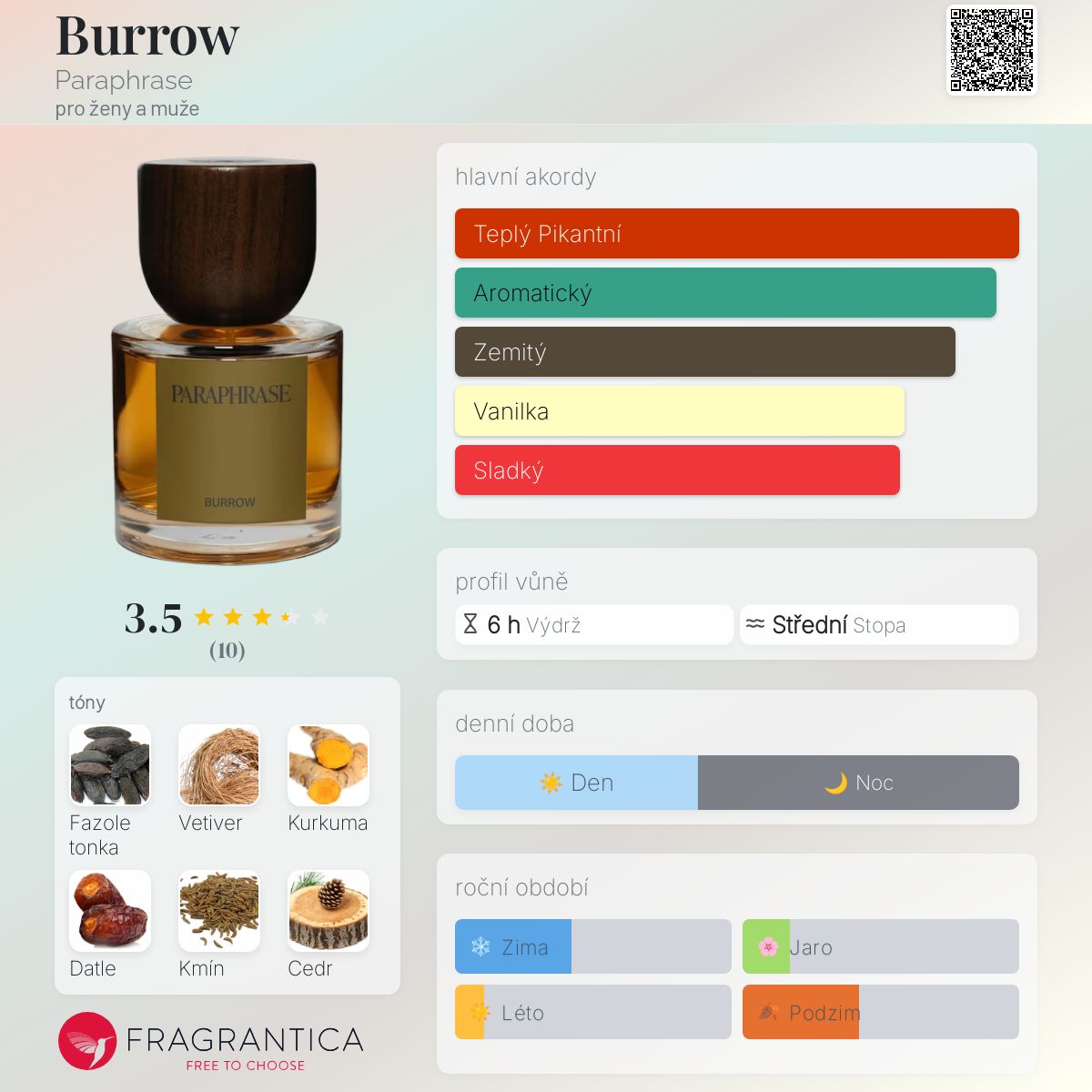 Burrow podle Paraphrase je Woody Spicy vůně pro ženy a muže. Burrow byl/a uveden/a v roce 2021. "Nosem" za touto vůní je Joshua Smith. Vrchní tóny jsou Kurkuma a Kmín; střední tóny jsouDatle a Cedr ; základní tóny jsou Fazole tonka a Vetiver.