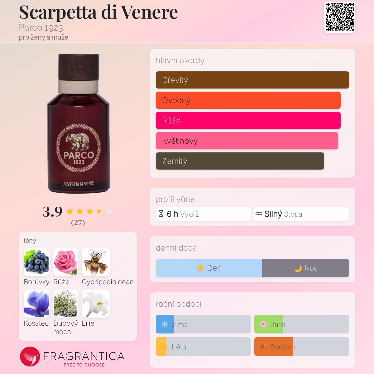 Scarpetta di Venere podle Parco 1923 je Floral vůně pro ženy a muže. Scarpetta di Venere byl/a uveden/a v roce 2018. "Nosem" za touto vůní je Luca Maffei. Vrchní tóny jsou Borůvky a Růže; střední tóny jsouCypripedioideae, Kosatec, Červená lilie a Štědřenec ; základní tóny jsou Dubový mech a Buk.