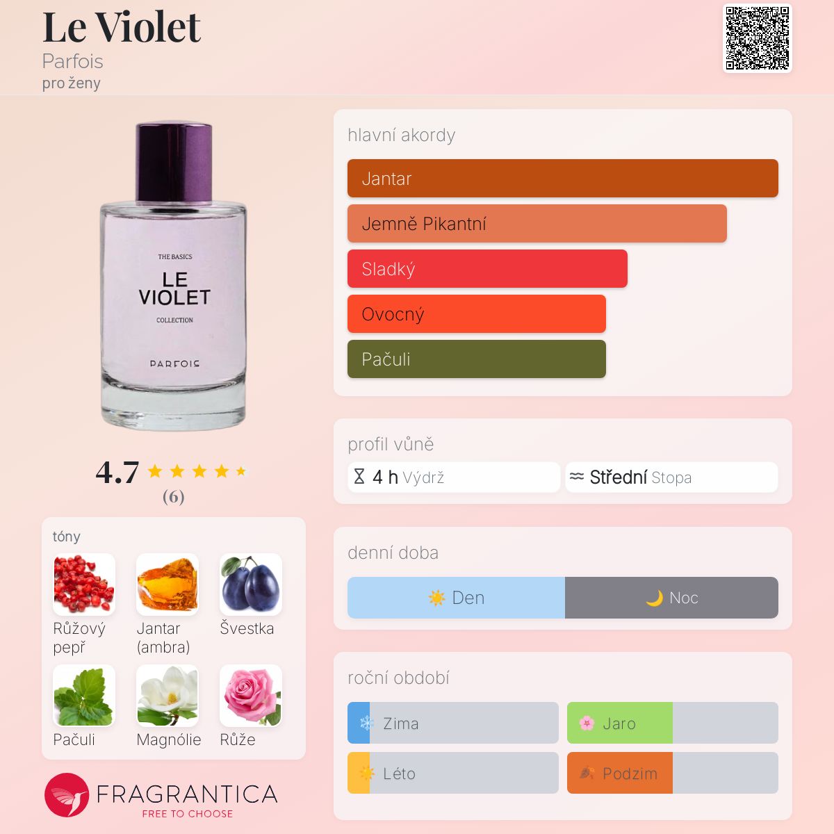 Le Violet podle Parfois je Chypre Floral vůně pro ženy. Toto je nová vůně. Le Violet byl/a uveden/a v roce 2024. Vrchní tóny jsou Růžový pepř a Damašská švestka; střední tóny jsouMagnólie a Růže ; základní tóny jsou Jantar (ambra), Pačuli a Mech.