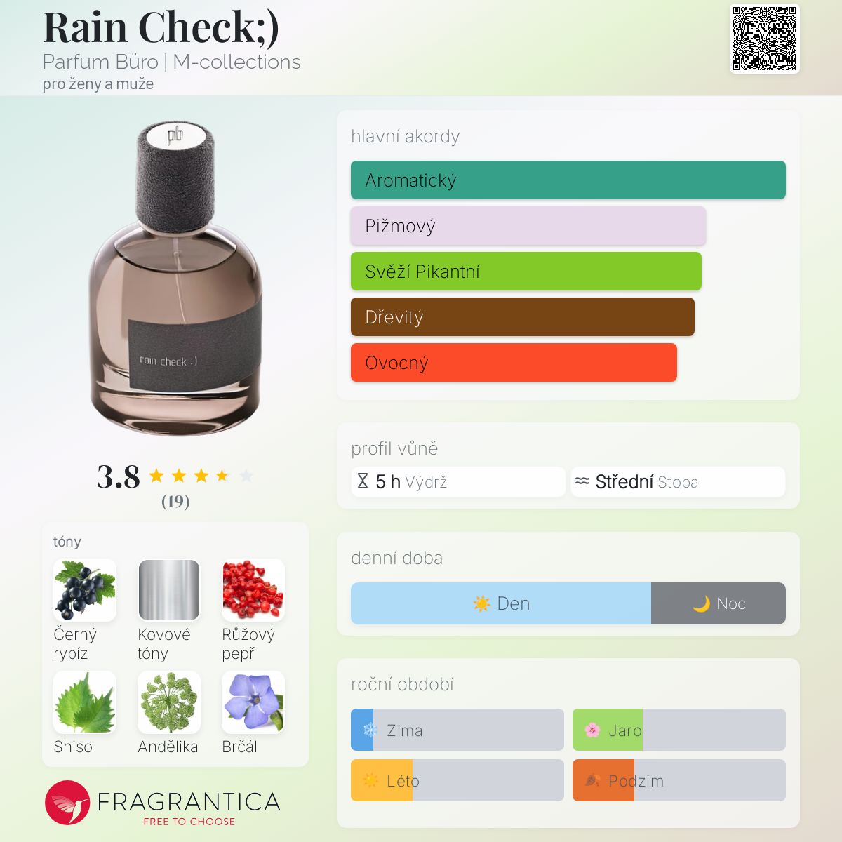 Rain Check;) podle Parfum Büro | M-collections je Woody Aquatic vůně pro ženy a muže. Rain Check;) byl/a uveden/a v roce 2021. "Nosem" za touto vůní je Maurizio Cerizza. Vrchní tóny jsou Černý rybíz, Kovové tóny, Růžový pepř, Andělika a Grapefruit; střední tóny jsouShiso, Brčál, Jalovcové bobulky, Bazalka, Jasmín a Magnólie ; základní tóny jsou Dřevo cypřišku tupolistého, Semínka okry, Cedr, Mořská řasa a Pižmo.