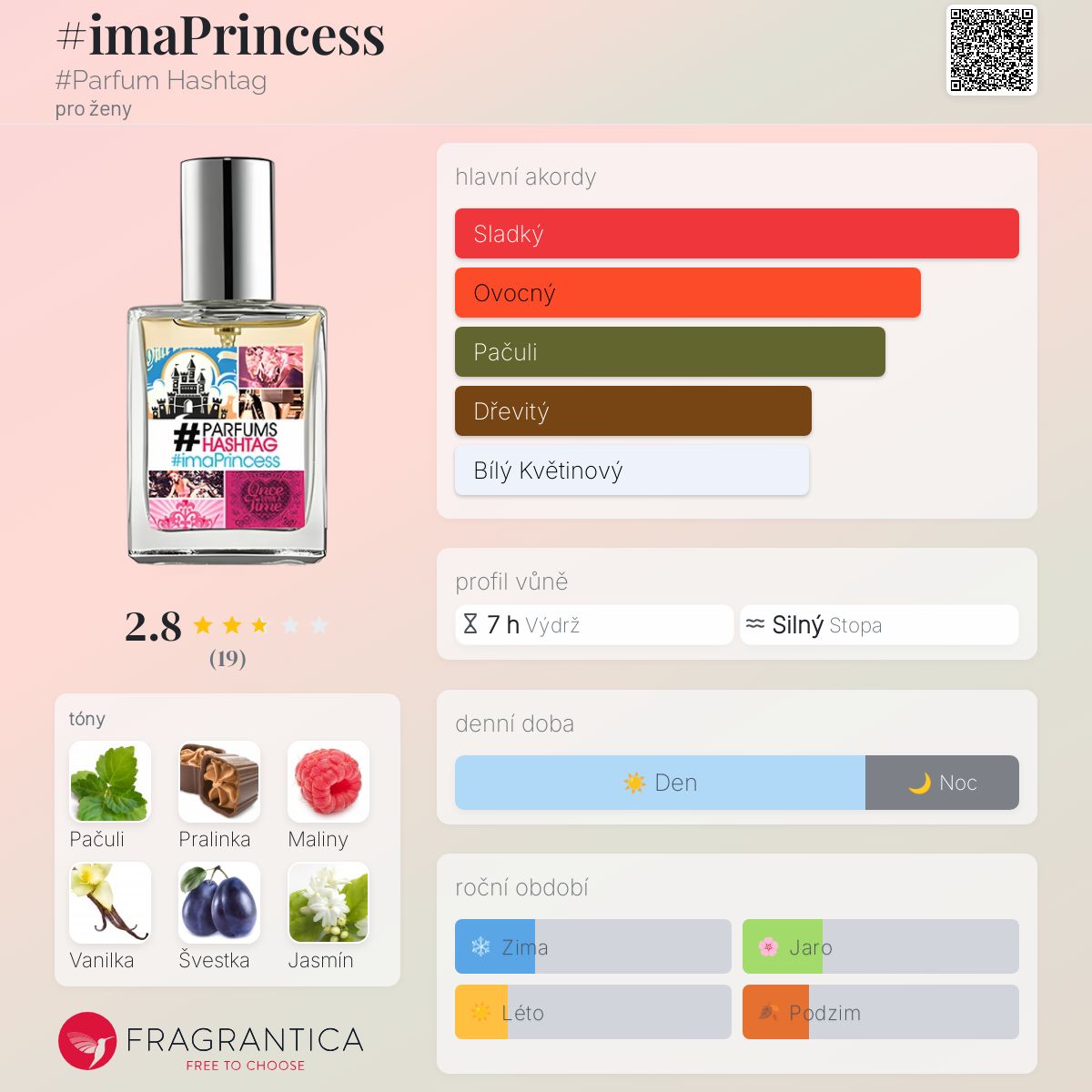 #imaPrincess podle #Parfum Hashtag je Floral Fruity vůně pro ženy. #imaPrincess byl/a uveden/a v roce 2014. Vrchní tóny jsou Mandarinka a Pomerančový květ; střední tóny jsouMaliny, Švestka, Jasmín a Kosatec ; základní tóny jsou Pačuli, Pralinka, Vanilka a Pižmo.