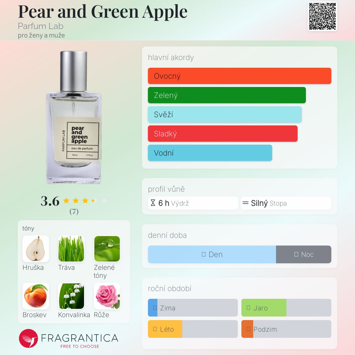 Pear and Green Apple podle Parfum Lab je Aromatic Fruity vůně pro ženy a muže. Toto je nová vůně. Pear and Green Apple byl/a uveden/a v roce 2024. "Nosem" za touto vůní je Samuel Moraes. Vrchní tóny jsou Hruška, Tráva, Zelené listí a Broskev; střední tóny jsouHruška, Konvalinka a Růže ; základní tóny jsou Bílé pižmo a Vanilka.