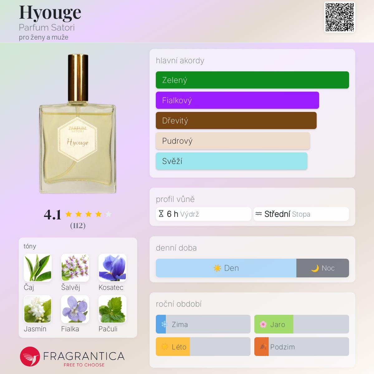 Hyouge podle Parfum Satori je Aromatic Green vůně pro ženy a muže. Hyouge byl/a uveden/a v roce 2008. "Nosem" za touto vůní je Satori Osawa. Vrchní tóny jsou Zelený čaj a Šalvěj; střední tóny jsouJasmín, Fialka a Pačuli ; základní tóny jsou Kosatec a Dřevité tóny.