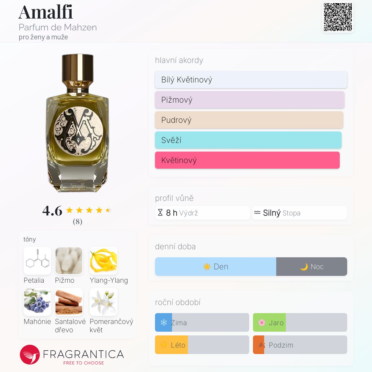 Amalfi podle Parfum de Mahzen je Floral Woody Musk vůně pro ženy a muže. Toto je nová vůně. Amalfi byl/a uveden/a v roce 2024. Amalfi byl/a vytvořen/a Eren Öğütcü a Özge Öğütcü. Vrchní tóny jsou Pomerančový květ, Aldehydy, Broskev, Mandarinka a Bergamot; střední tóny jsouPetalia, Ylang-Ylang, Mahónie, Tuberóza, Agáve, Vetiver a Lilie ; základní tóny jsou Bílé pižmo, Pižmo, Santalové dřevo, Vanilka, Ambroxan a Dřevité tóny.