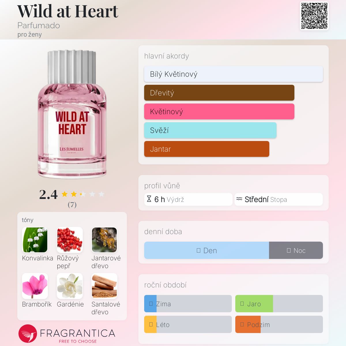 Wild at Heart podle Parfumado je Floral Woody Musk vůně pro ženy. Toto je nová vůně. Wild at Heart byl/a uveden/a v roce 2024. Vrchní tóny jsou Růžový pepř, Brambořík, Mandarinka a Kalábrijský bergamot; střední tóny jsouKonvalinka, Gardénie, Magnólie a Neroli ; základní tóny jsou Jantarové dřevo, Santalové dřevo, Ambrette (přírodní pižmo) a Kašmírové dřevo.