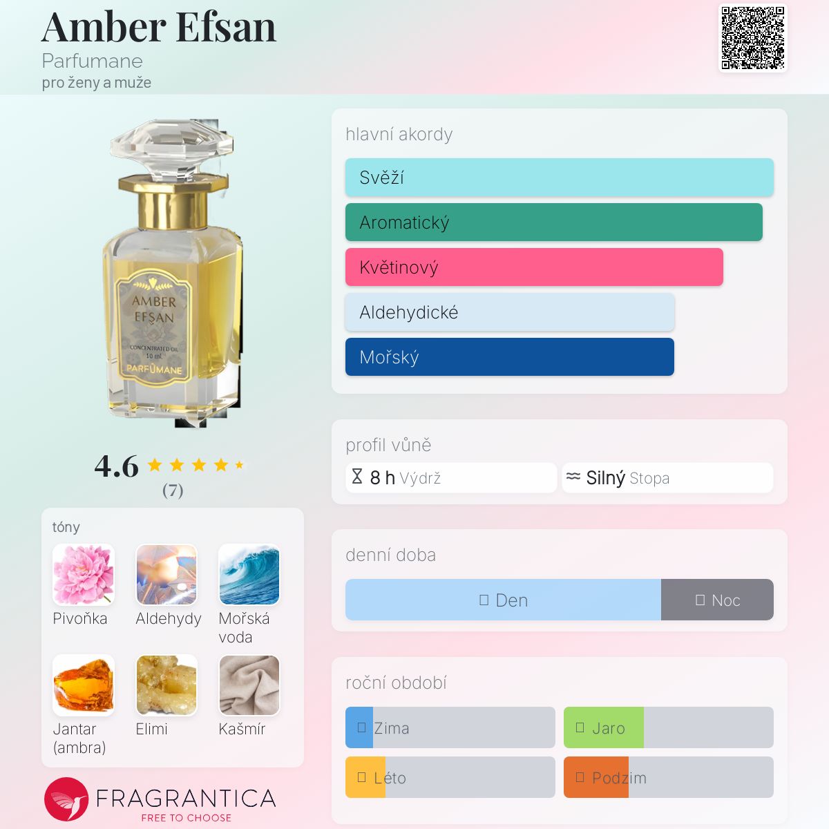 Amber Efsan podle Parfumane je Orientální vůně pro ženy a muže. Amber Efsan byl/a uveden/a v roce 2020. "Nosem" za touto vůní je Bekir Kantarcı. Vrchní tóny jsou Aldehydy, Elimi, Bergamot a Rebarbora; střední tóny jsouPivoňka, Mořské tóny, Pelargónie a Galbanum ; základní tóny jsou Jantar (ambra), Kašmír a Vetiver.