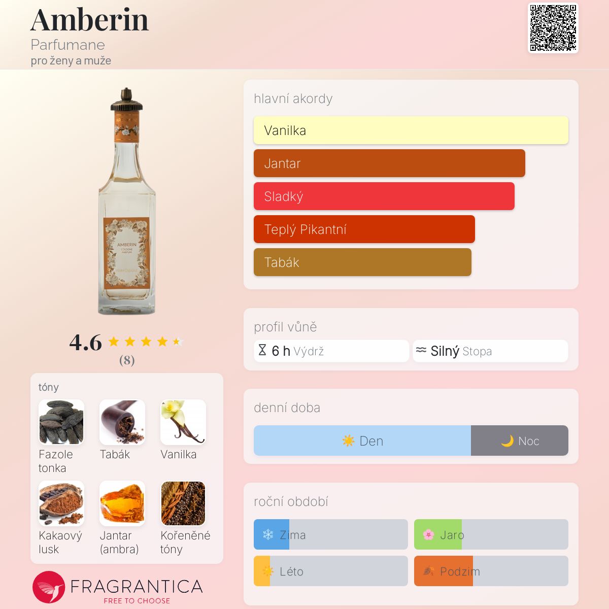 Amberin podle Parfumane je Orientální Vanilla vůně pro ženy a muže. Amberin byl/a uveden/a v roce 2020. "Nosem" za touto vůní je Bekir Kantarcı. Vrchní tóny jsou Tabákový list a Koření; střední tóny jsouFazole tonka, Vanilka a Kakao ; základní tóny jsou Jantar (ambra) a Dřevité tóny.