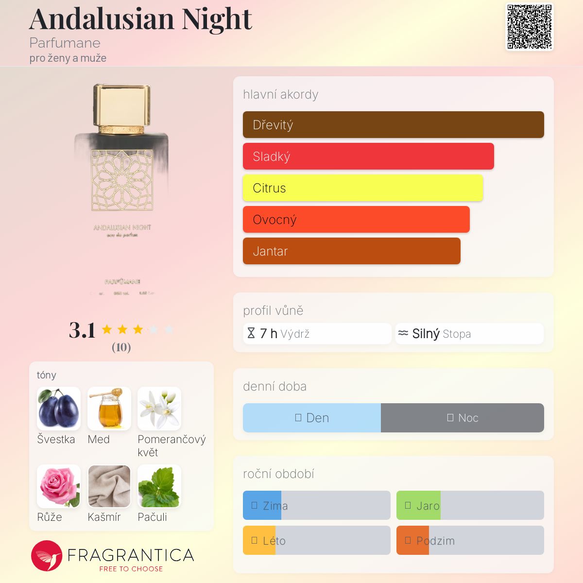 Andalusian Night podle Parfumane je Orientální vůně pro ženy a muže. Andalusian Night byl/a uveden/a v roce 2020. "Nosem" za touto vůní je Bekir Kantarcı. Vrchní tóny jsou Švestka, Pomerančový květ, Růže, Mandarinka a Citrón; střední tóny jsouMed, Růže, Kašmír a Konvalinka ; základní tóny jsou Pačuli, Styrax, Santalové dřevo, Pižmo a Cedr.