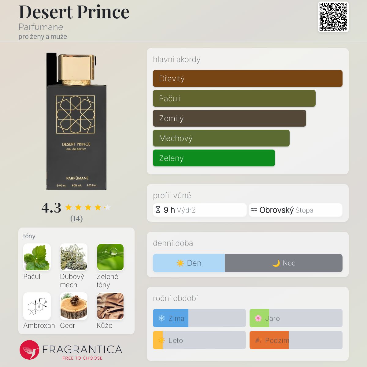Desert Prince podle Parfumane je Orientální vůně pro ženy a muže. Desert Prince byl/a uveden/a v roce 2020. "Nosem" za touto vůní je Bekir Kantarcı. Vrchní tóny jsou Pačuli a Bylinné tóny; střední tóny jsouPačuli, Ambroxan a Cedr ; základní tóny jsou Pačuli, Mech a Kůže.