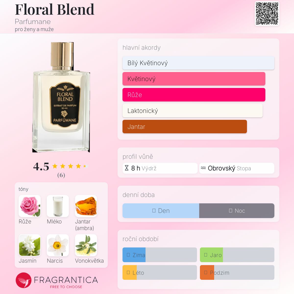 Floral Blend podle Parfumane je Floral vůně pro ženy a muže. Floral Blend byl/a uveden/a v roce 2022. "Nosem" za touto vůní je Bekir Kantarcı. Vrchní tóny jsou Růže, Jasmín a Vonokvětka; střední tóny jsouMléko, Narcis a Tuberóza ; základní tóny jsou Jantar (ambra) a Cedr.