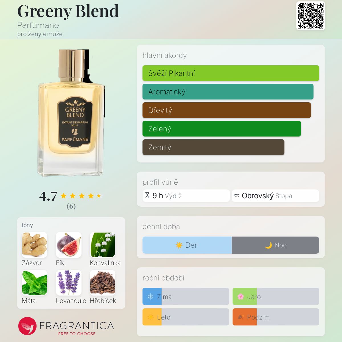 Greeny Blend podle Parfumane je Floral vůně pro ženy a muže. Greeny Blend byl/a uveden/a v roce 2022. "Nosem" za touto vůní je Bekir Kantarcı. Vrchní tóny jsou Zázvor, Fík, Levandule, Hřebíček a Bergamot; střední tóny jsouKonvalinka, Máta peprná, Otočník, Pelargónie a Pomerančový květ ; základní tóny jsou Labdanum, Pačuli, Vetiver, Kůže, Mech a Jantar (ambra).