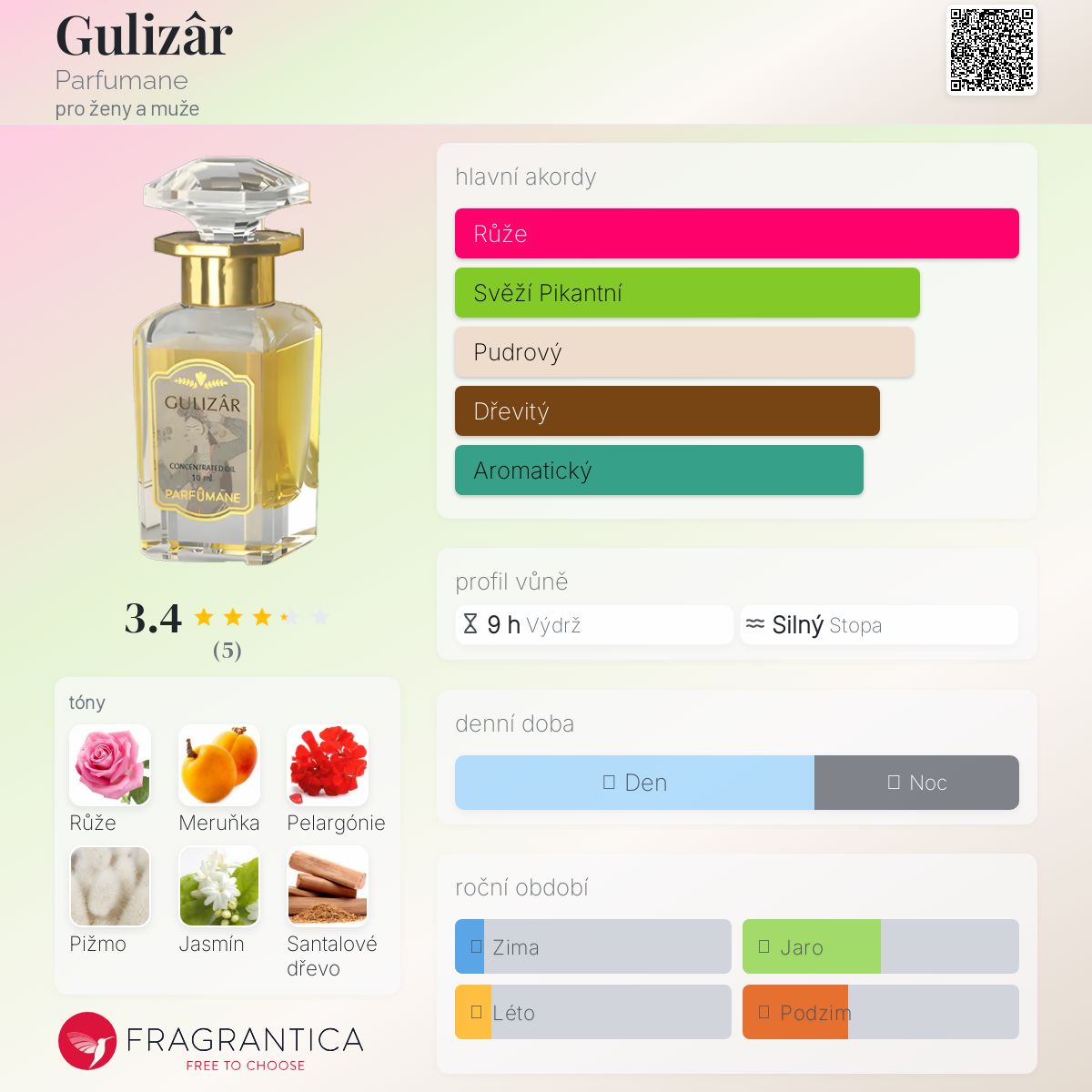 Gulizâr podle Parfumane je Floral vůně pro ženy a muže. Gulizâr byl/a uveden/a v roce 2020. "Nosem" za touto vůní je Bekir Kantarcı. Vrchní tóny jsou Růže, Ovoce a Pepř; střední tóny jsouMeruňka, Pelargónie, Jasmín a Cedr ; základní tóny jsou Pižmo, Santalové dřevo a Jantar (ambra).