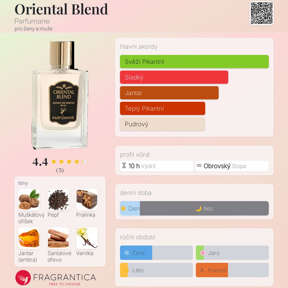 Oriental Blend podle Parfumane je Orientální vůně pro ženy a muže. Oriental Blend byl/a uveden/a v roce 2022. "Nosem" za touto vůní je Bekir Kantarcı. Vrchní tóny jsou Muškátový oříšek a Pepř; střední tóny jsouPralinka, Pivoňka a Lilie ; základní tóny jsou Jantar (ambra), Santalové dřevo a Vanilka.