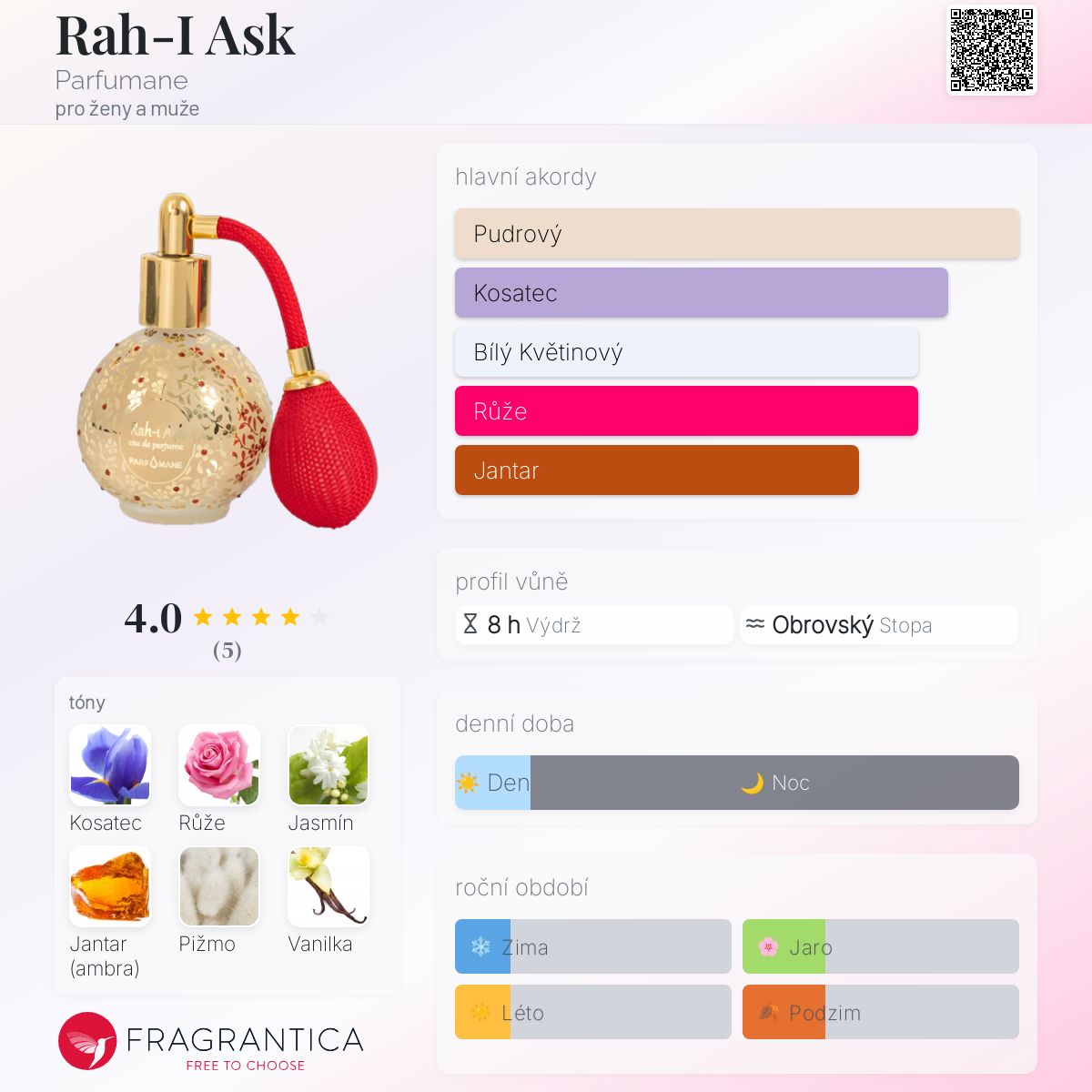 Rah-I Ask podle Parfumane je Floral Woody Musk vůně pro ženy a muže. Rah-I Ask byl/a uveden/a v roce 2020. "Nosem" za touto vůní je Bekir Kantarcı. Vrchní tóny jsou Kosatec, Mandarinka a Pepř; střední tóny jsouRůže, Jasmín a Cedr ; základní tóny jsou Jantar (ambra), Pižmo a Vanilka.