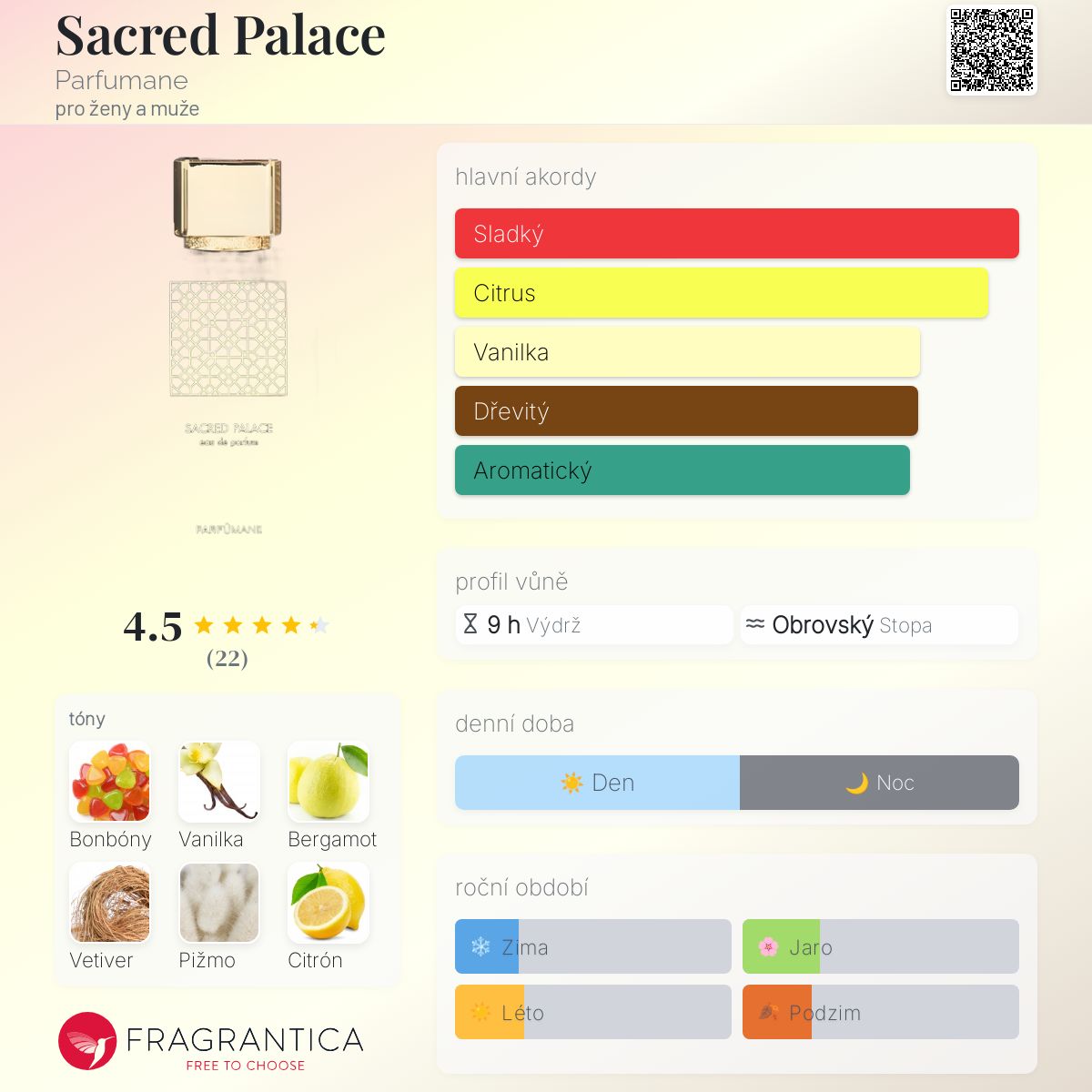 Sacred Palace podle Parfumane je Orientální vůně pro ženy a muže. Sacred Palace byl/a uveden/a v roce 2020. "Nosem" za touto vůní je Bekir Kantarcı. Vrchní tóny jsou Bergamot a Citrón; střední tóny jsouVetiver, Cedr a Jasmín ; základní tóny jsou Sladké tóny, Vanilka a Pižmo.