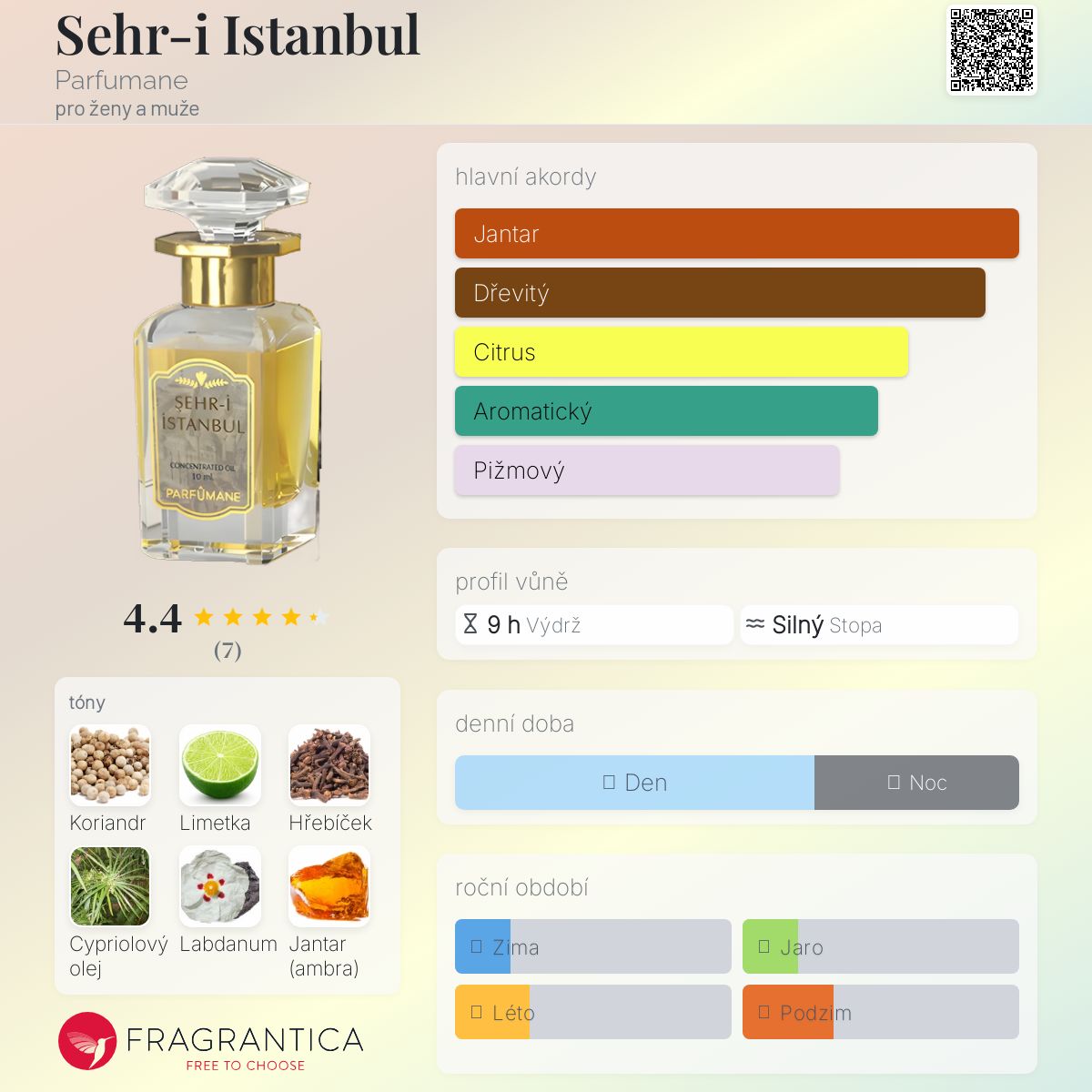 Sehr-i Istanbul podle Parfumane je Orientální Spicy vůně pro ženy a muže. Sehr-i Istanbul byl/a uveden/a v roce 2020. "Nosem" za touto vůní je Bekir Kantarcı. Vrchní tóny jsou Koriandr, Limetka, Citrón a Pomeranč; střední tóny jsouHřebíček, Cypriolový olej a Konvalinka ; základní tóny jsou Labdanum, Jantar (ambra), Pižmo, Jantarové dřevo a Vetiver.