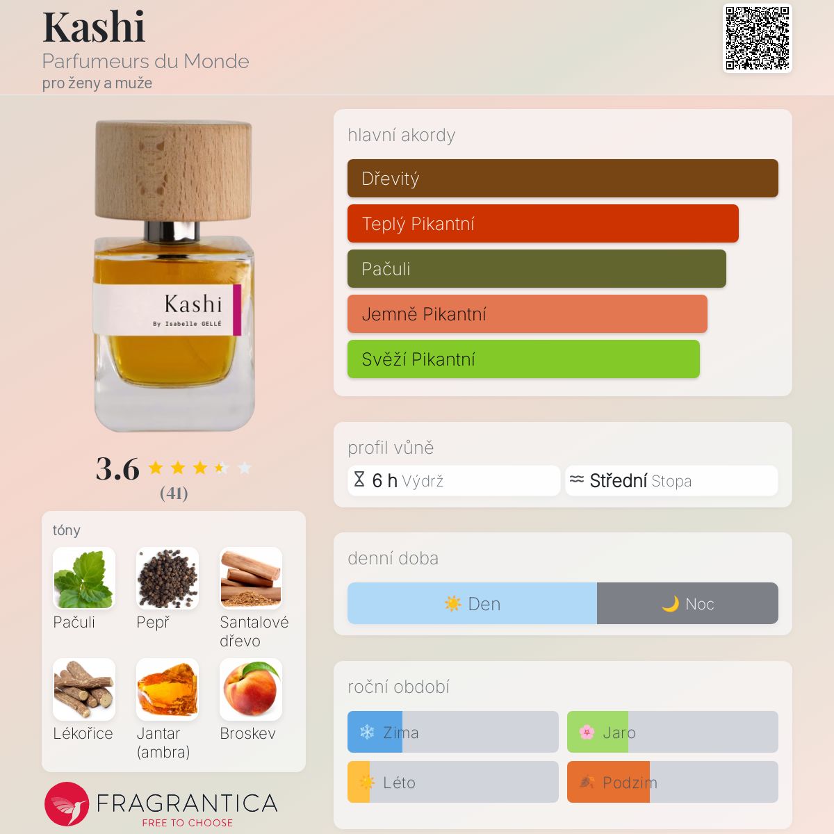 Kashi podle Parfumeurs du Monde je Floral Fruity vůně pro ženy a muže. Kashi byl/a uveden/a v roce 2016. "Nosem" za touto vůní je Isabelle Gellé. Vrchní tóny jsou Černý pepř, Fenykl, Ibišek a Kosatec; střední tóny jsouPačuli, Lékořice, Jantar (ambra), Broskev, Vonokvětka a Indický jasmín ; základní tóny jsou Santalové dřevo, Vanilka, Ylang-Ylang a Bílé pižmo.