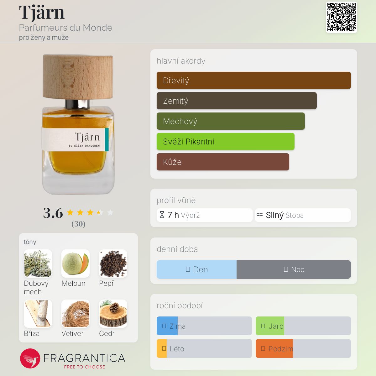 Tjärn podle Parfumeurs du Monde je Aromatic Aquatic vůně pro ženy a muže. Tjärn byl/a uveden/a v roce 2021. "Nosem" za touto vůní je Ellen Dahlgren. Vrchní tóny jsou Meloun, Černý pepř, Kardamom a Citrón; střední tóny jsouBříza, Cedr, Maliny, Tabák a Pelargónie ; základní tóny jsou Dubový mech, Vetiver, Benzoin a Pačuli.