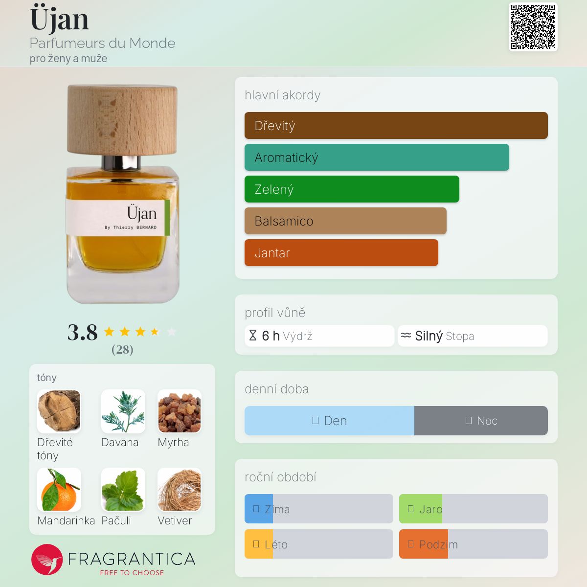 Üjan podle Parfumeurs du Monde je Woody vůně pro ženy a muže. Üjan byl/a uveden/a v roce 2019. "Nosem" za touto vůní je Thierry Bernard. Vrchní tóny jsou Davana, Mandarinka a Černý rybíz; střední tóny jsouAgarové dřevo (oud), Jasmín a Růže ; základní tóny jsou Dřevité tóny, Myrha, Pačuli a Vetiver.