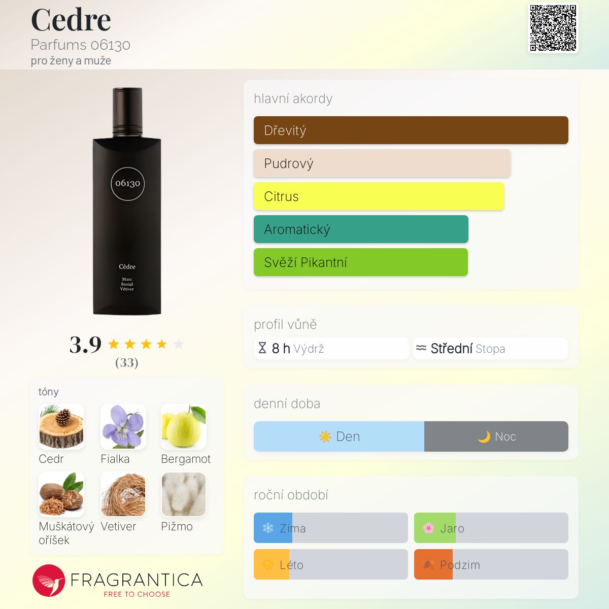 Cedre podle Parfums 06130 je Woody Spicy vůně pro ženy a muže. Cedre byl/a uveden/a v roce 2003. "Nosem" za touto vůní je Raphael Haury. Vrchní tóny jsou Fialka, Bergamot, Grapefruit a Mandarinka; střední tóny jsouVirginský cedr, Muškátový oříšek a Kardamom ; základní tóny jsou Vetiver, Pižmo, Ambra a Santalové dřevo.