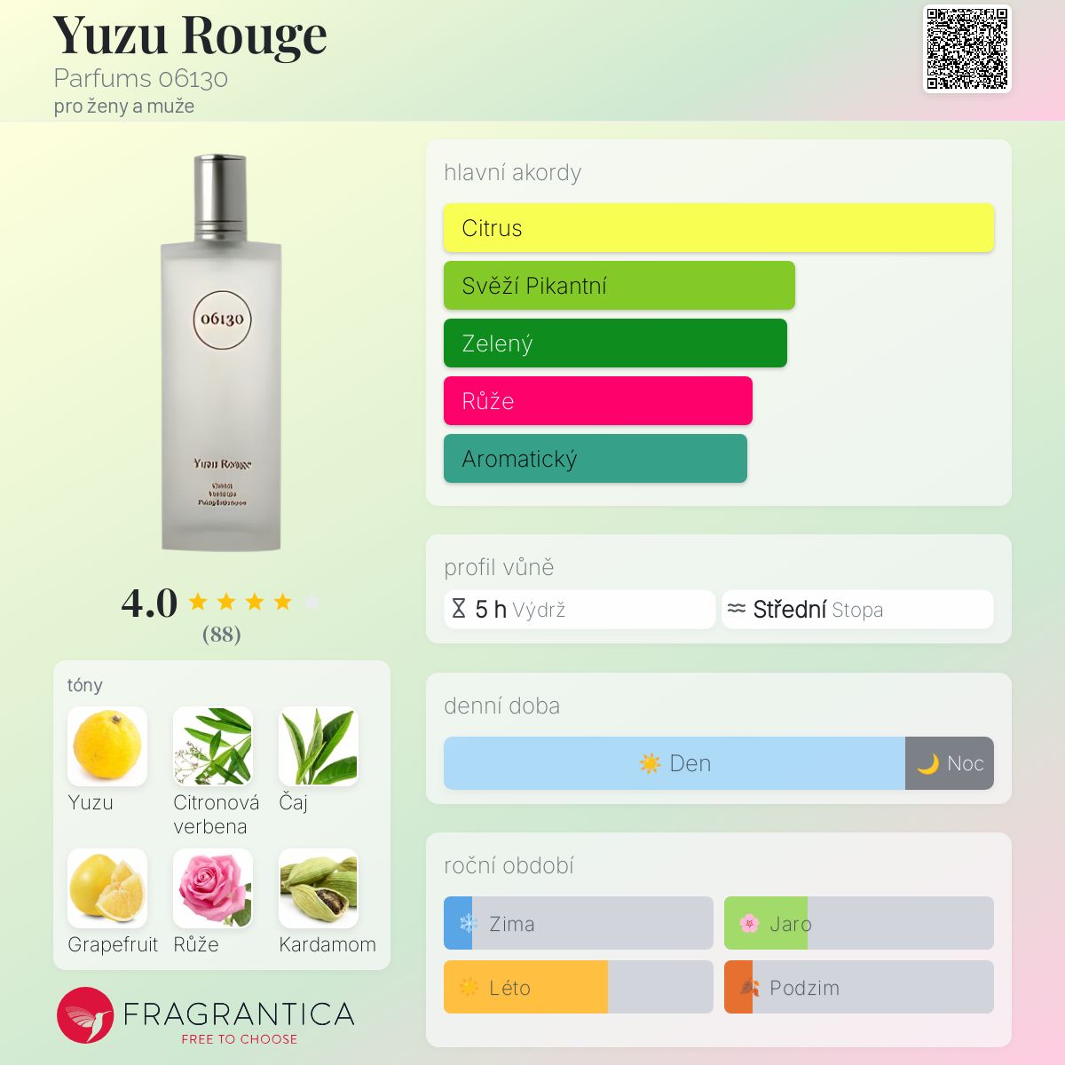 Yuzu Rouge podle Parfums 06130 je Citrus Aromatic vůně pro ženy a muže. Vrchní tóny jsou Yuzu, Grapefruit, Bergamot a Černý rybíz; střední tóny jsouCitronová verbena, Růže, Kardamom a Muškátový oříšek ; základní tóny jsou Zelený čaj, Ambra, Mech a Pižmo.