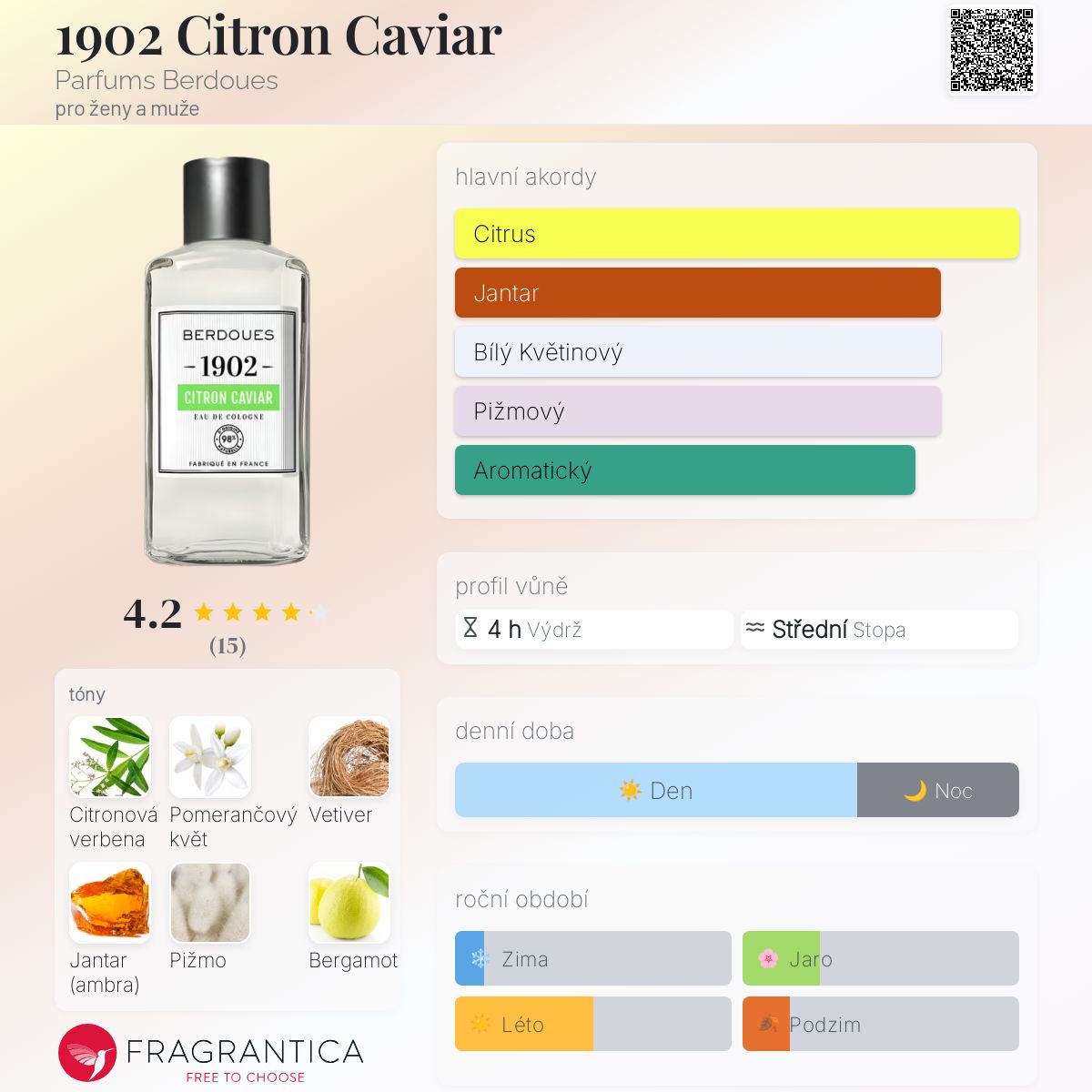 1902 Citron Caviar podle Parfums Berdoues je Aromatic vůně pro ženy a muže. 1902 Citron Caviar byl/a uveden/a v roce 2021. Vrchní tóny jsou Sporýš, Bergamot a Citrón; střední tóny jsouPomerančový květ, Zázvor a Kardamom ; základní tóny jsou Vetiver, Jantar (ambra) a Pižmo.