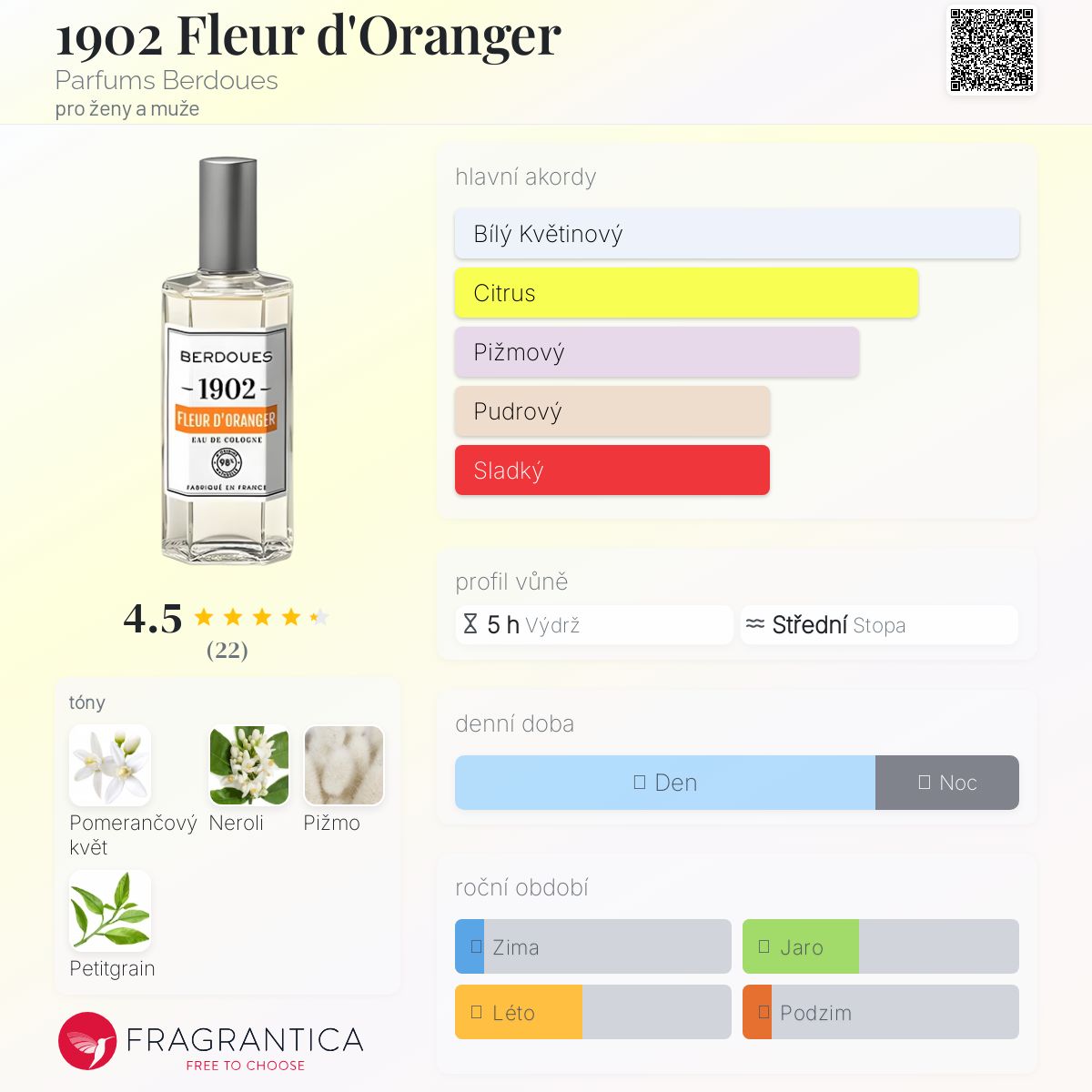 1902 Fleur d'Oranger podle Parfums Berdoues je vůně pro ženy a muže. Vrchní tóny jsou Neroli a Petitgrain; střední tón jePomerančový květ ; základní tón je Bílé pižmo.