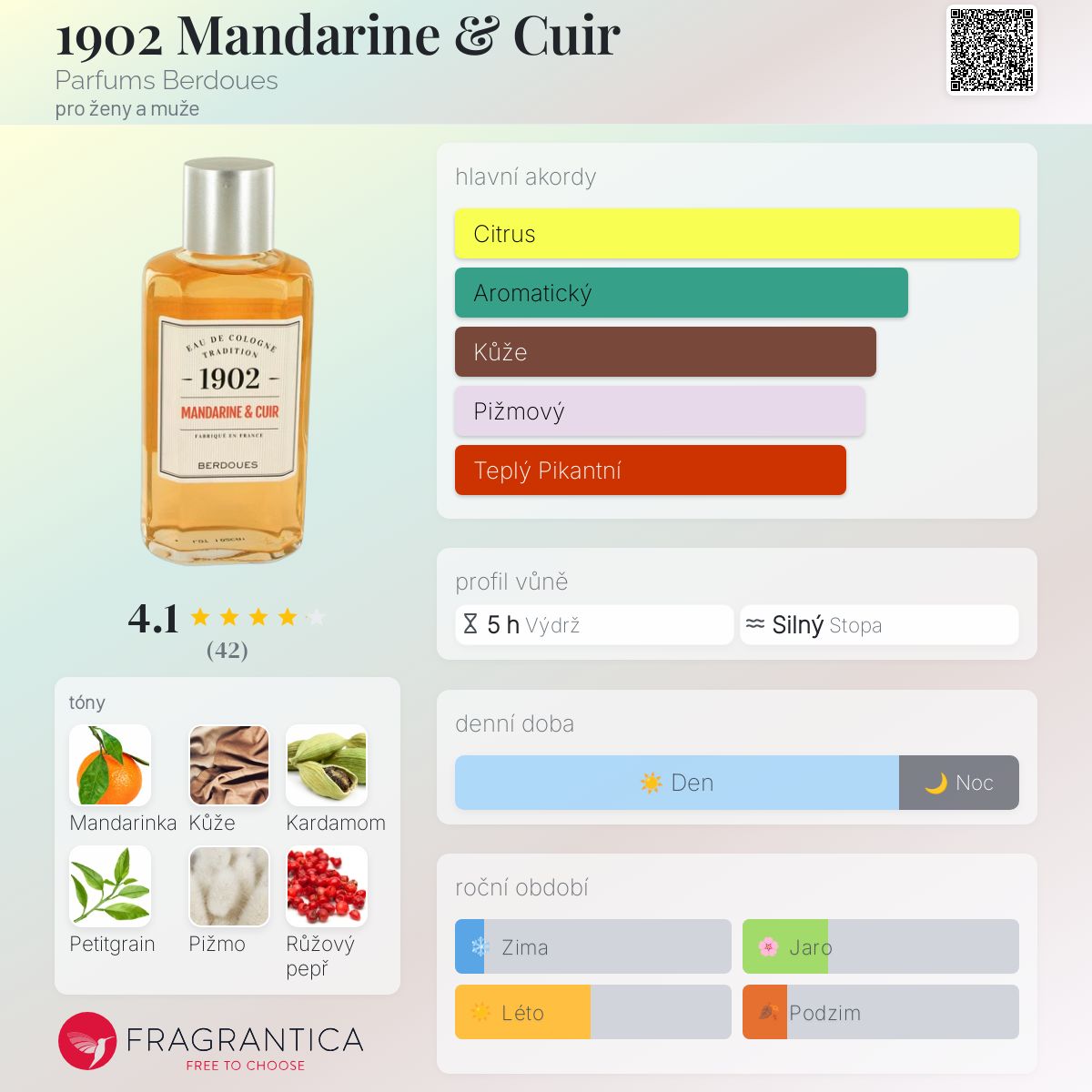 1902 Mandarine & Cuir podle Parfums Berdoues je Citrus Aromatic vůně pro ženy a muže. 1902 Mandarine & Cuir byl/a uveden/a v roce 2015. Vrchní tóny jsou Mandarinka, Kardamom a Růžový pepř; střední tóny jsouMandarinkový list a Květinové tóny ; základní tóny jsou Kůže, Pižmo a Vetiver.