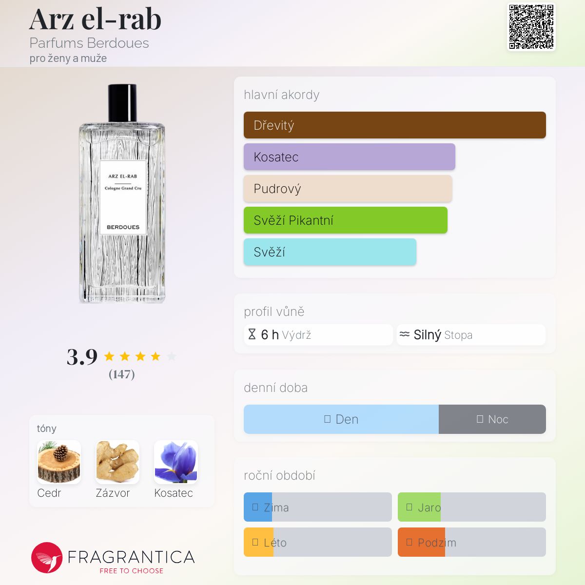 Arz el-rab podle Parfums Berdoues je Woody Spicy vůně pro ženy a muže. Arz el-rab byl/a uveden/a v roce 2015. "Nosem" za touto vůní je Cyrill Rolland. Vrchní tón je Zázvor ; střední tón jeKosatec ; základní tón je Cedr.