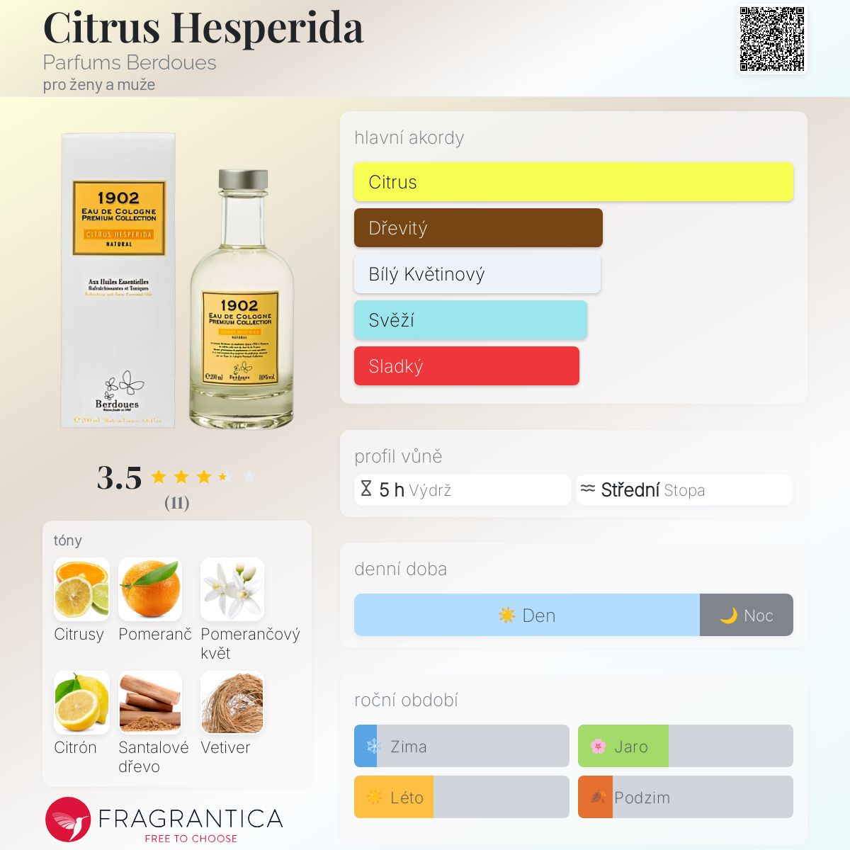 Citrus Hesperida podle Parfums Berdoues je Citrus vůně pro ženy a muže. Citrus Hesperida byl/a uveden/a v roce 1902. Vrchní tóny jsou Citrusy, Pomeranč a Citrón; střední tóny jsouKvět afrického pomeranče a Vetiver ; základní tóny jsou Santalové dřevo a Pižmo.