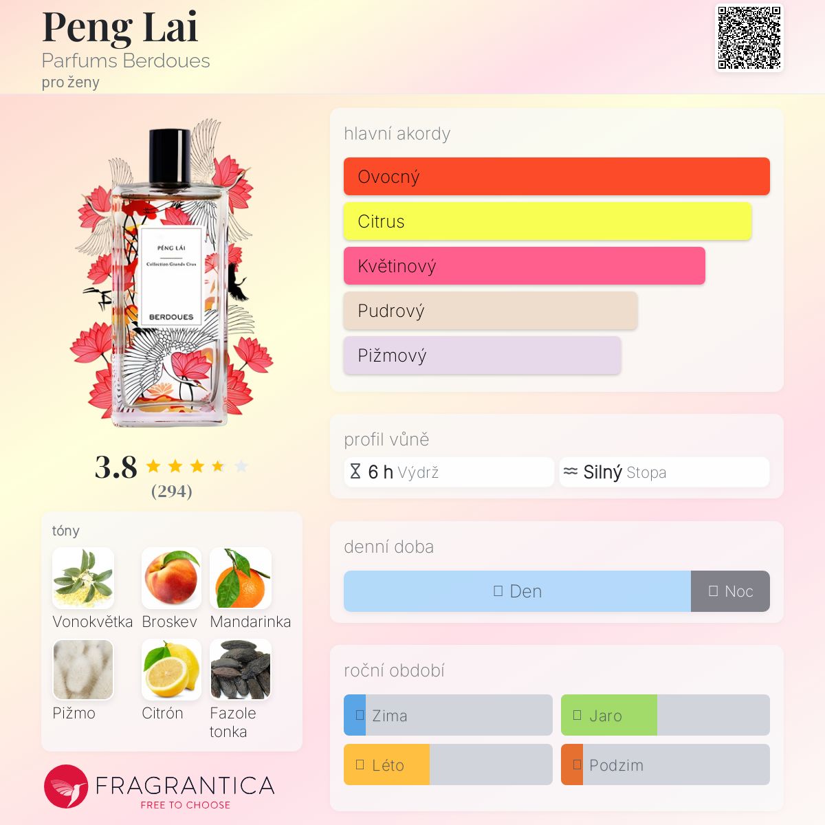 Peng Lai podle Parfums Berdoues je Orientální Floral vůně pro ženy. Peng Lai byl/a uveden/a v roce 2018. Vrchní tóny jsou Vonokvětka čínská, Mandarinka, Citrón a Bergamot; střední tóny jsouBroskev, Růže, Pomerančový květ a Benzoin ; základní tóny jsou Bílé pižmo, Fazole tonka, Fialka, Iso E Super a Vanilka.