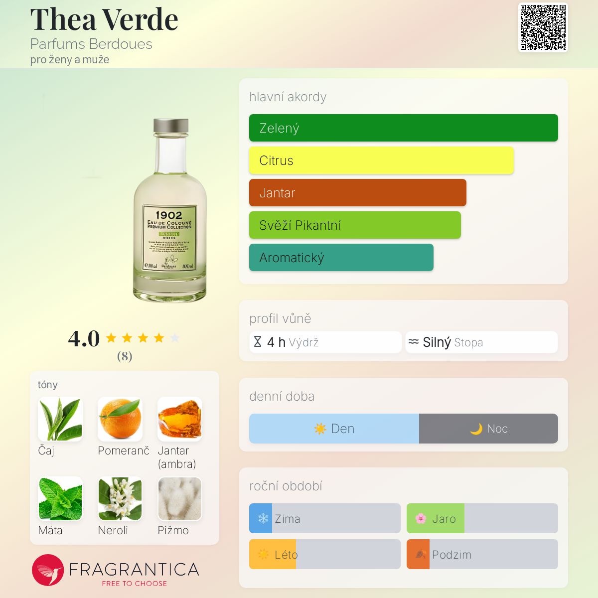 Thea Verde podle Parfums Berdoues je Aromatic Green vůně pro ženy a muže. Thea Verde byl/a uveden/a v roce 1902. Vrchní tóny jsou Pomeranč a Máta; střední tóny jsouČaj a Neroli ; základní tóny jsou Jantar (ambra) a Pižmo.