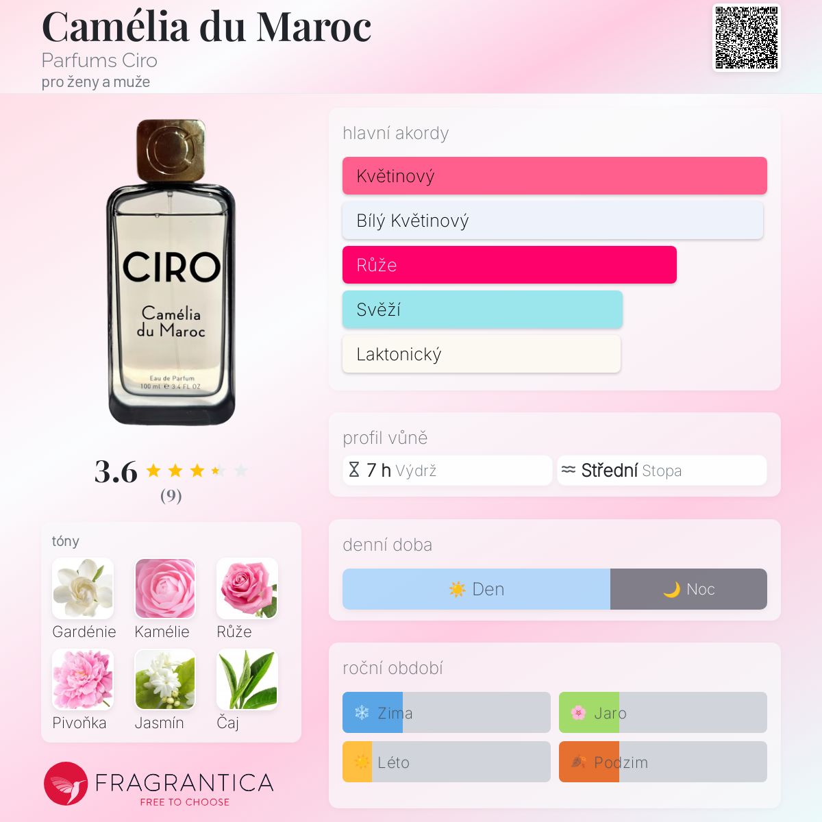 Camélia du Maroc podle Parfums Ciro je Floral vůně pro ženy a muže. Toto je nová vůně. Camélia du Maroc byl/a uveden/a v roce 2025. Vrchní tóny jsou Pivoňka, Zelený čaj, Grapefruit a Mandarinka; střední tóny jsouKamélie, Okvětní lístky růží a Jasmín Sambac ; základní tóny jsou Gardénie, Ambroxan a Pižmo.