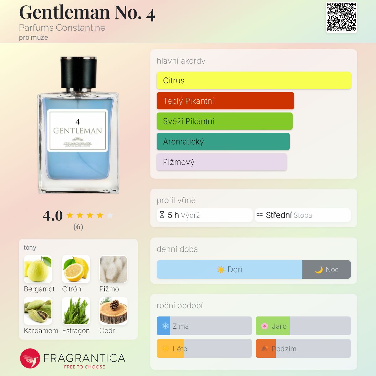 Gentleman No. 4 podle Parfums Constantine je Woody Aquatic vůně pro muže. Gentleman No. 4 byl/a uveden/a v roce 2015. Vrchní tóny jsou Bergamot, Citrón, Kardamom a Palisandr; střední tóny jsouEstragon, Extrakt z bílého cedru, Pepř a Šalvěj ; základní tóny jsou Pižmo, Jantar (ambra), Šafrán a Dřevité tóny.