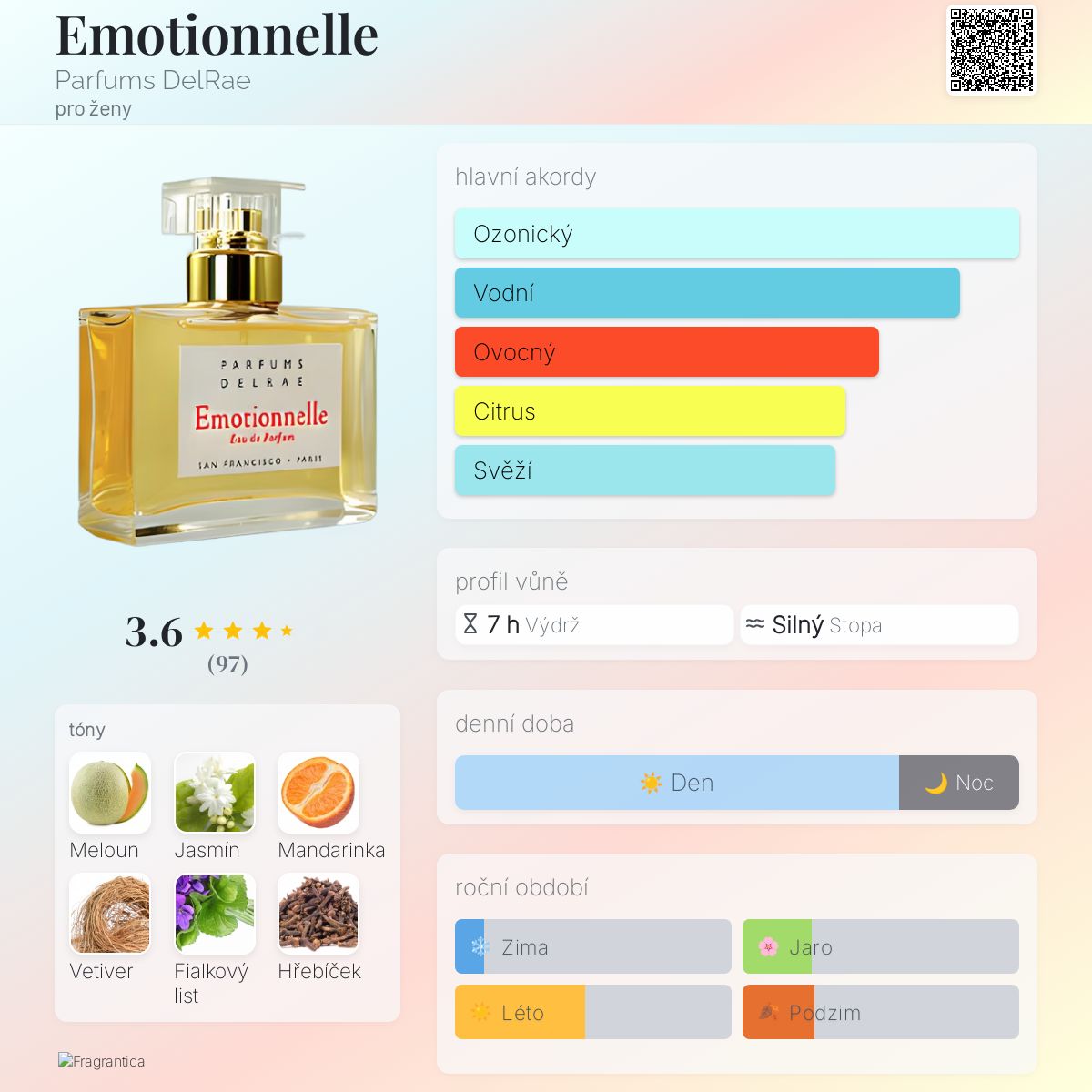 Emotionnelle podle Parfums DelRae je Floral Fruity Gourmand vůně pro ženy. Emotionnelle byl/a uveden/a v roce 2006. "Nosem" za touto vůní je Michel Roudnitska. Vrchní tóny jsou Meloun, Mandarinka a Bergamot; střední tóny jsouJasmín, Fialkový list, Švestka a Růže ; základní tóny jsou Vetiver, Hřebíček, Jantar (ambra) a Virginský cedr.