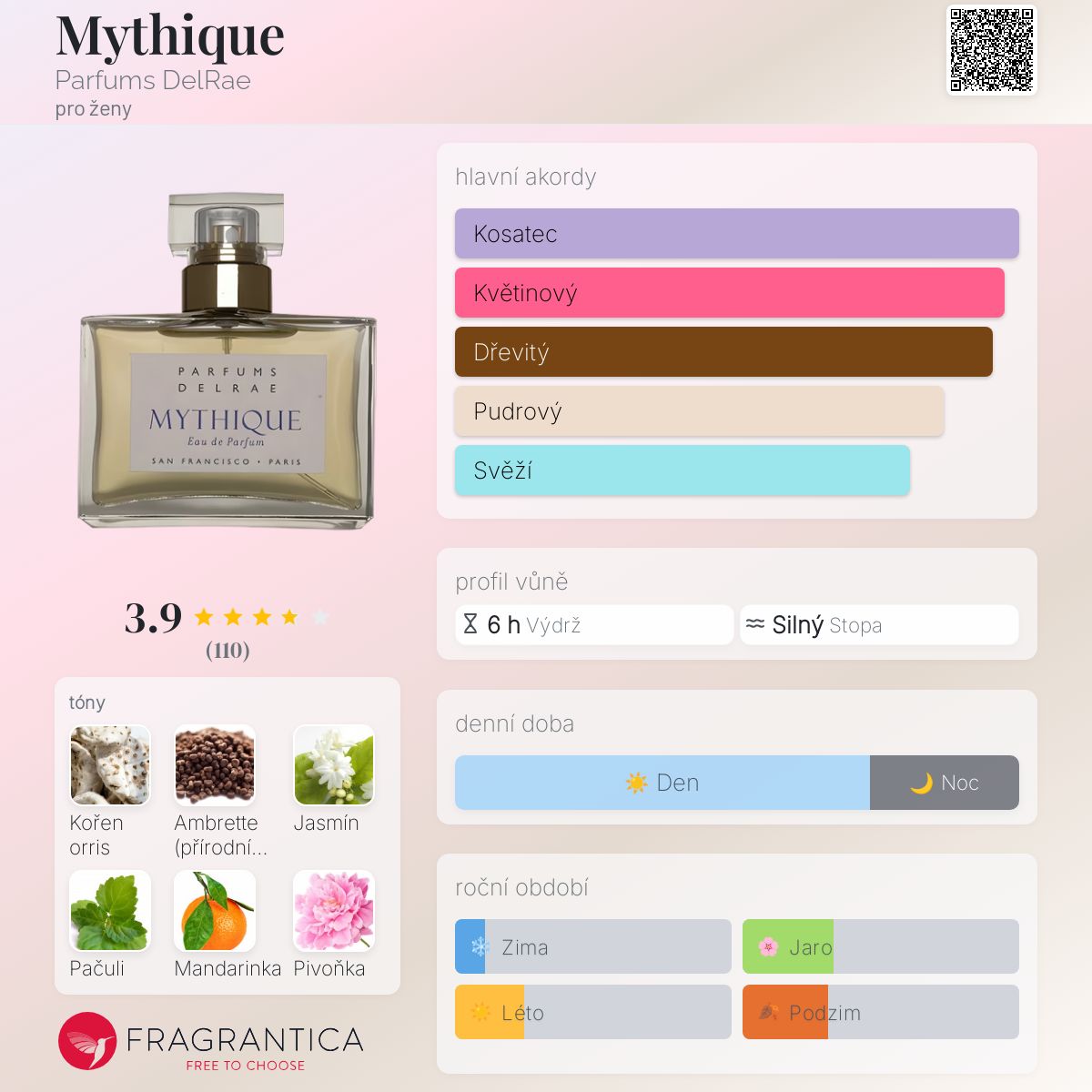 Mythique podle Parfums DelRae je Floral Woody Musk vůně pro ženy. "Nosem" za touto vůní je Yann Vasnier. Vrchní tóny jsou Mandarinka a Bergamot; střední tóny jsouOrris, Jasmín a Pivoňka ; základní tóny jsou Ambrette (přírodní pižmo), Pačuli a Santalové dřevo.