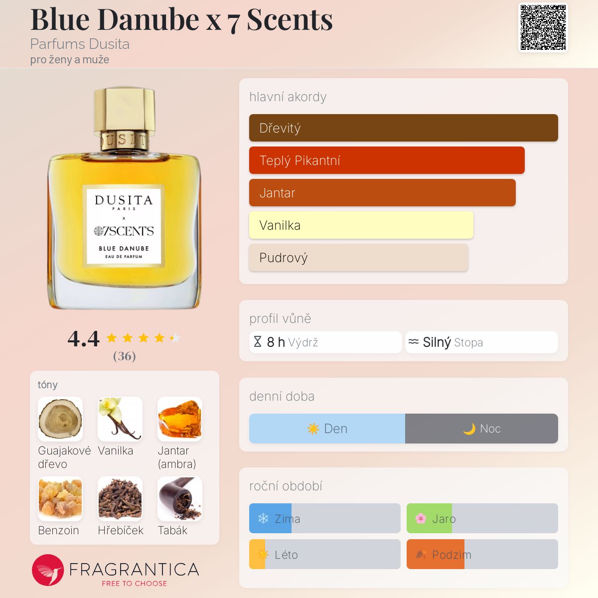 Blue Danube x 7 Scents podle Parfums Dusita je Orientální vůně pro ženy a muže. Toto je nová vůně. Blue Danube x 7 Scents byl/a uveden/a v roce 2025. "Nosem" za touto vůní je Pissara Umavijani. Vrchní tóny jsou Kardamom a Sušené ovoce; střední tóny jsouBenzoin, Hřebíček, Tabák, Orris a Santalové dřevo ; základní tóny jsou Guajakové dřevo, Madagaskarská vanilka, Jantar (ambra) a Virginský cedr.
