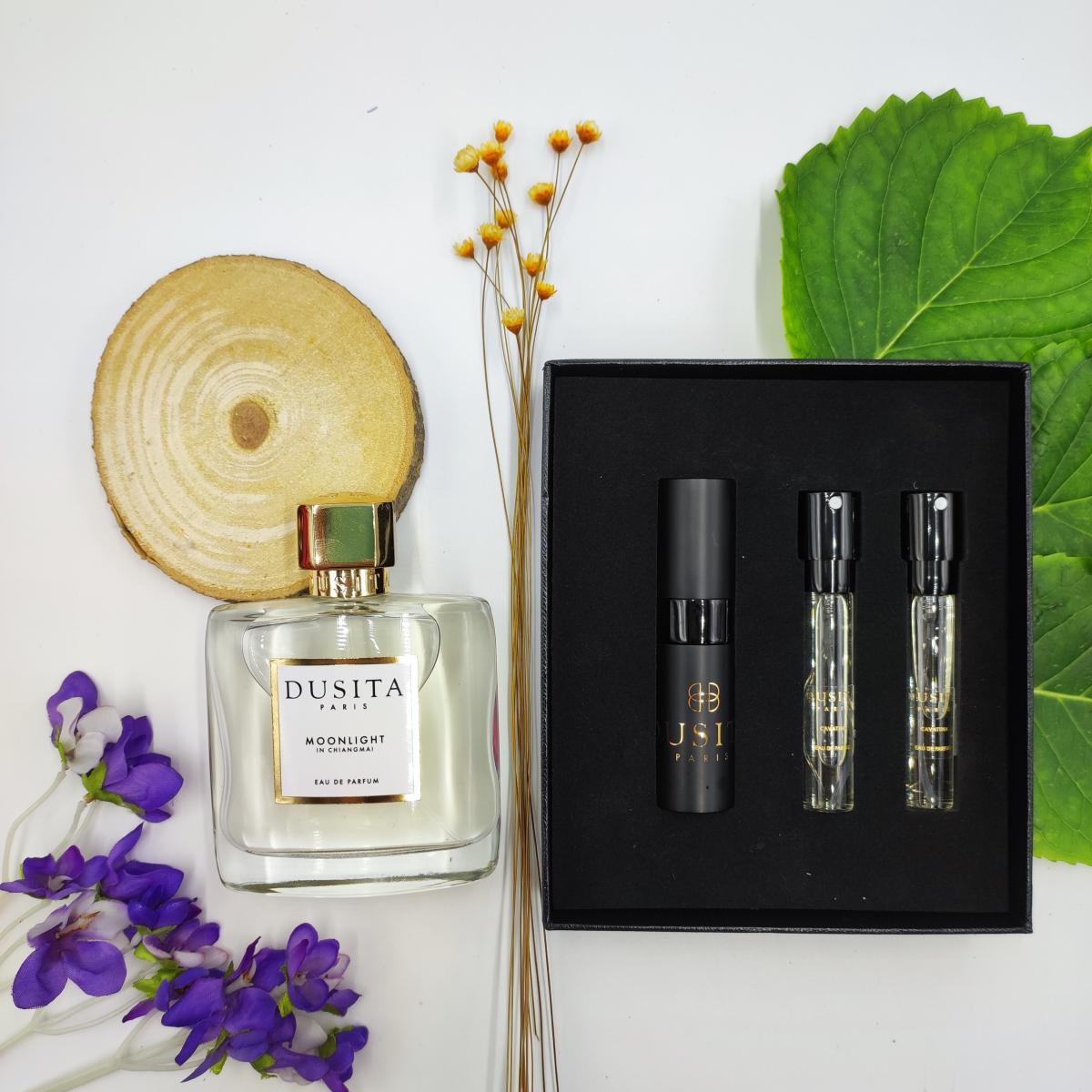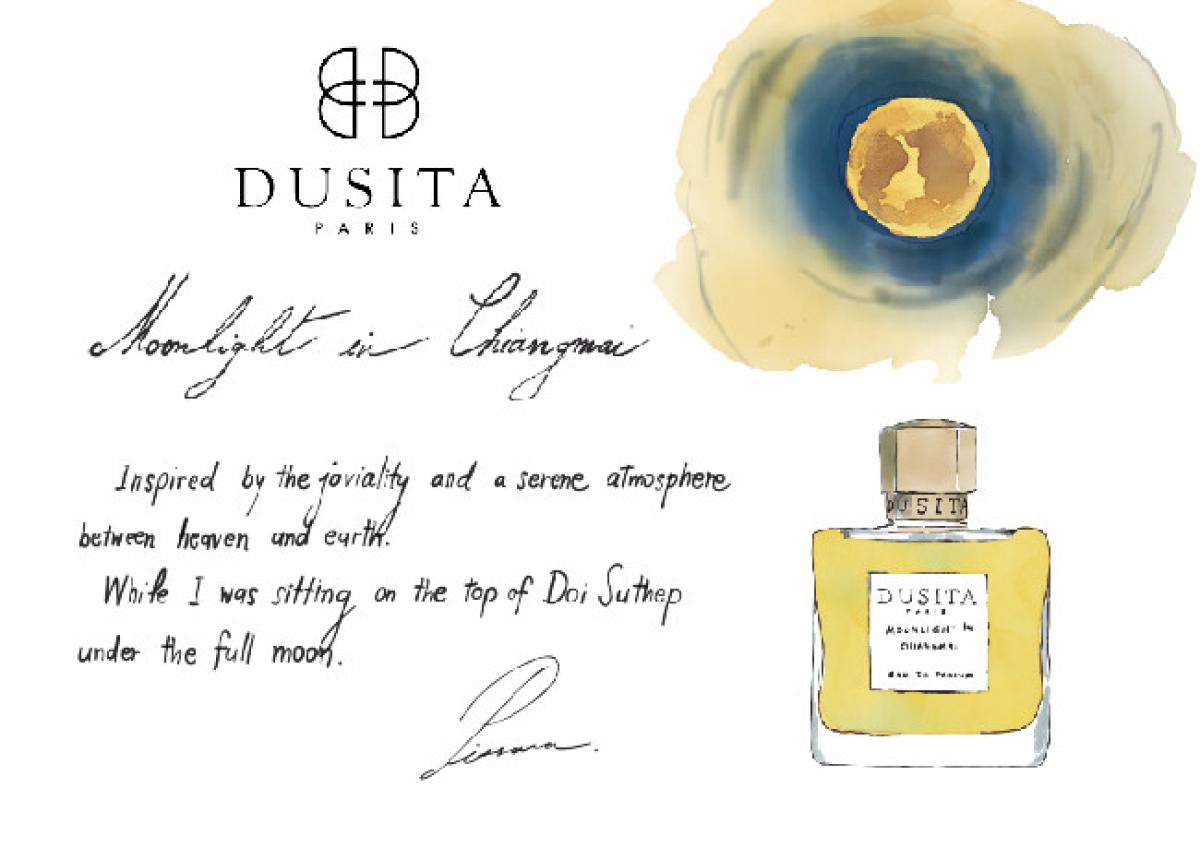 Moonlight in Chiangmai podle Parfums Dusita je Woody Aromatic vůně pro muže. Moonlight in Chiangmai byl/a uveden/a v roce 2020. "Nosem" za touto vůní je Pissara Umavijani. Vrchní tóny jsou Yuzu a Jasmín; střední tóny jsouMuškátový oříšek a Benzoin ; základní tóny jsou Týkové dřevo, Vetiver, Myrha a Pačuli.