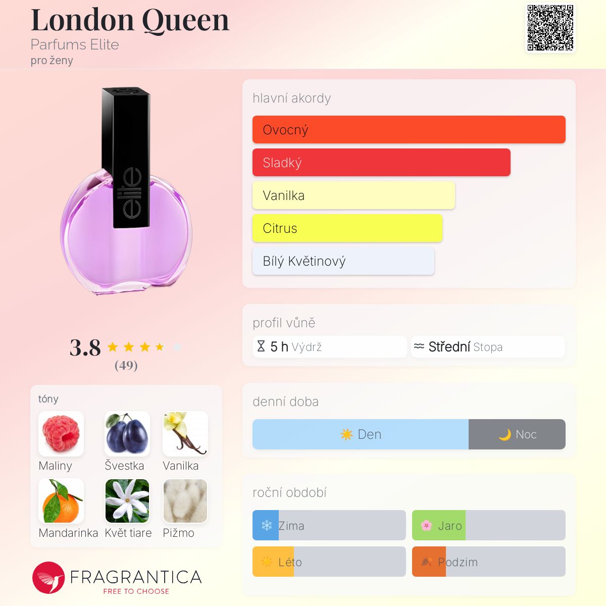 London Queen podle Parfums Elite je Floral Fruity vůně pro ženy. London Queen byl/a uveden/a v roce 2012. "Nosem" za touto vůní je Marie Salamagne. Vrchní tóny jsou Maliny, Mandarinka a Bergamot; střední tóny jsouŠvestka, Květ tiare a Jasmín ; základní tóny jsou Vanilka, Pižmo a Benzoin.