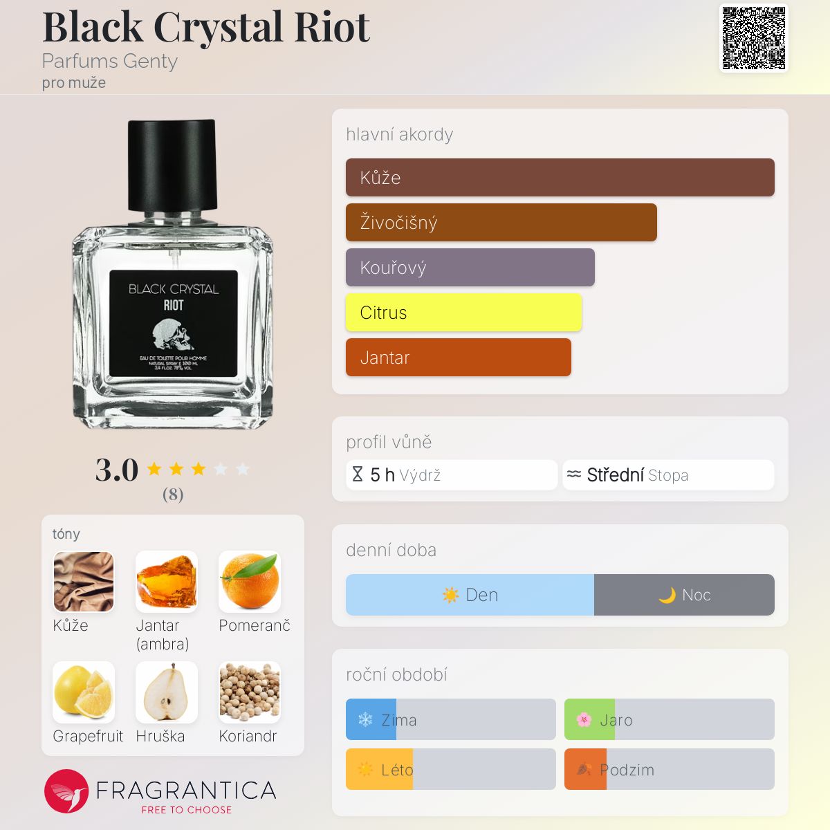 Black Crystal Riot podle Parfums Genty je Woody Aromatic vůně pro muže. Toto je nová vůně. Black Crystal Riot byl/a uveden/a v roce 2024. Vrchní tóny jsou Pomeranč, Hruška, Grapefruit a Bergamot; střední tóny jsouKoriandr, Levandule a Pelargónie ; základní tóny jsou Kůže, Jantar (ambra) a Vetiver.
