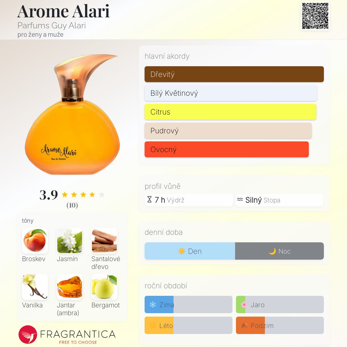Arome Alari podle Parfums Guy Alari je Orientální Floral vůně pro ženy a muže. Arome Alari byla spuštěna během 2020. Vrchní tóny jsou Broskev, Bergamot, Švestka, Galbanum, Mandarinka, Citrón, Aldehydy a Měsíček; střední tóny jsouJasmín, Zázvor, Konvalinka, Pomerančový květ, Fialka a Růže ; základní tóny jsou Santalové dřevo, Vanilka, Jantar (ambra) a Cedr.
