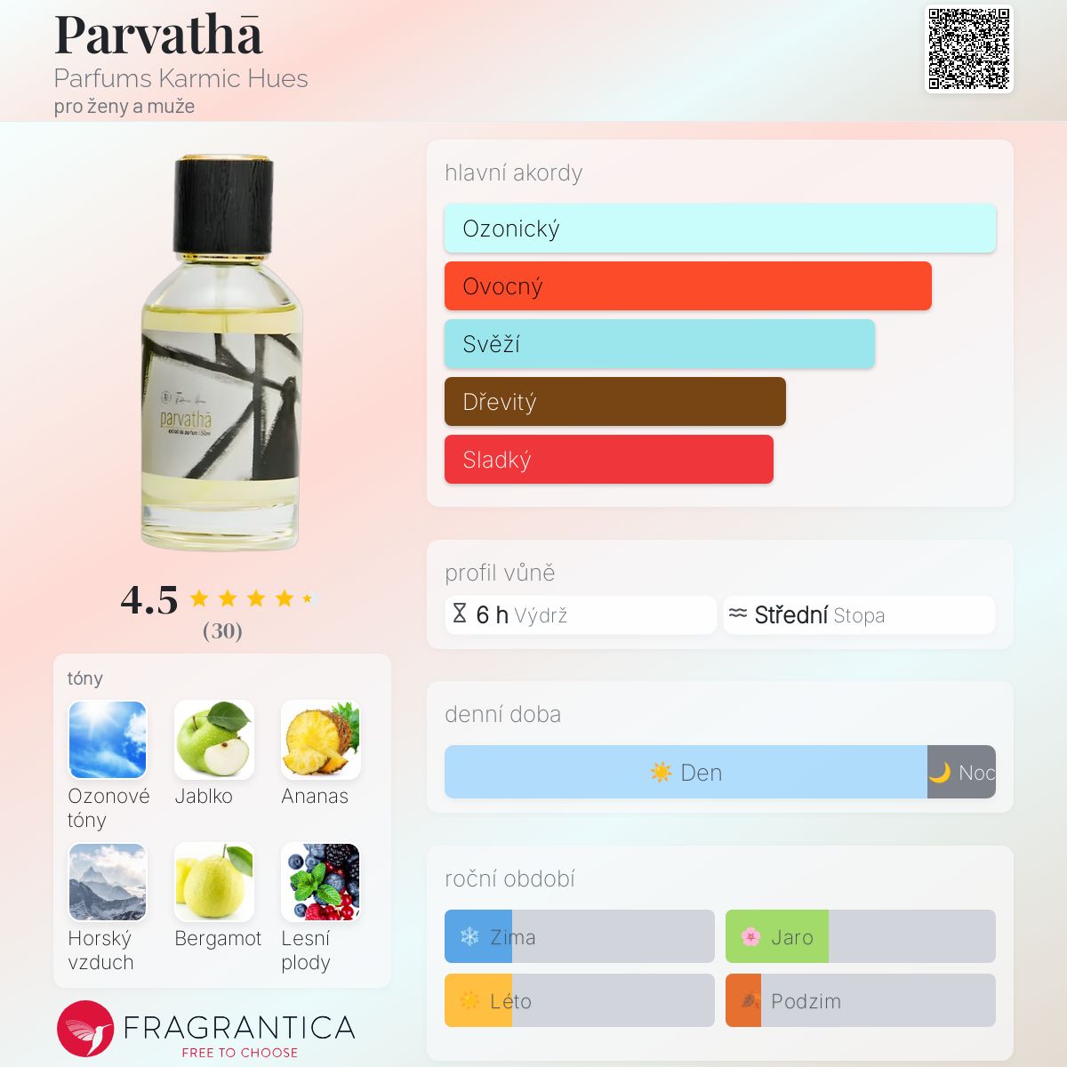 Parvathā podle Parfums Karmic Hues je Woody Aromatic vůně pro ženy a muže. Parvathā byl/a uveden/a v roce 2021. "Nosem" za touto vůní je Srivathsa Subramanian Sivakumar.