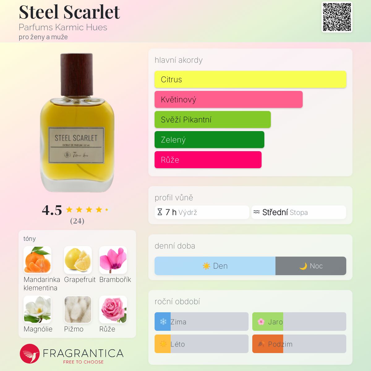 Steel Scarlet podle Parfums Karmic Hues je Orientální Floral vůně pro ženy a muže. Steel Scarlet byl/a uveden/a v roce 2023. "Nosem" za touto vůní je Srivathsa Subramanian Sivakumar.