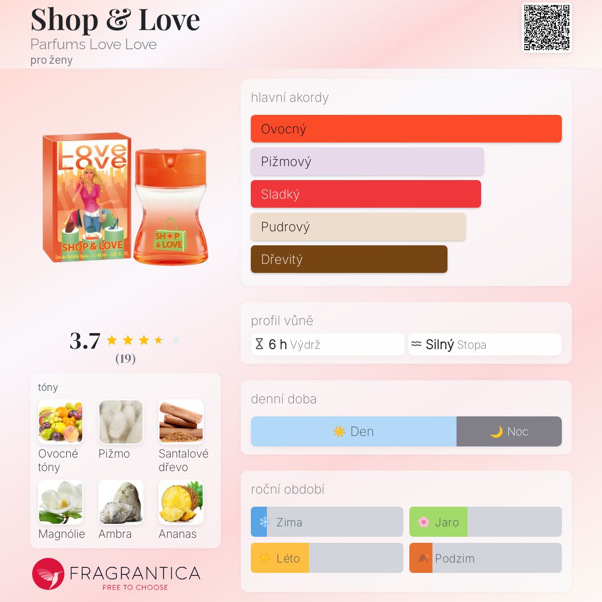 Shop & Love podle Parfums Love Love je Floral Fruity vůně pro ženy. Shop & Love byl/a uveden/a v roce 2012. "Nosem" za touto vůní je Julien Rasquinet. Vrchní tóny jsou Ananas, Zelené jablko a Černý rybíz; střední tóny jsouOvocné tóny, Magnólie a Růže ; základní tóny jsou Pižmo, Santalové dřevo a Ambra.