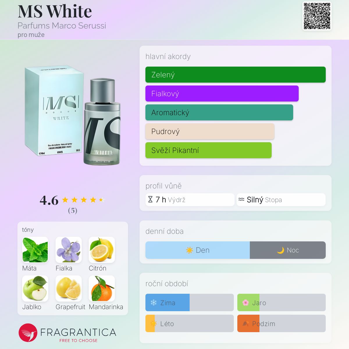 MS White podle Parfums Marco Serussi je Aromatic Spicy vůně pro muže. MS White byl/a uveden/a v roce 2013. "Nosem" za touto vůní je Julie Massé. Vrchní tóny jsou Citrón, Zelené jablko, Grapefruit a Mandarinka; střední tóny jsouMáta, Fialka, Levandule, Kardamom, Skořice a Muškátový oříšek ; základní tóny jsou Fazole tonka, Jantar (ambra) a Pižmo.